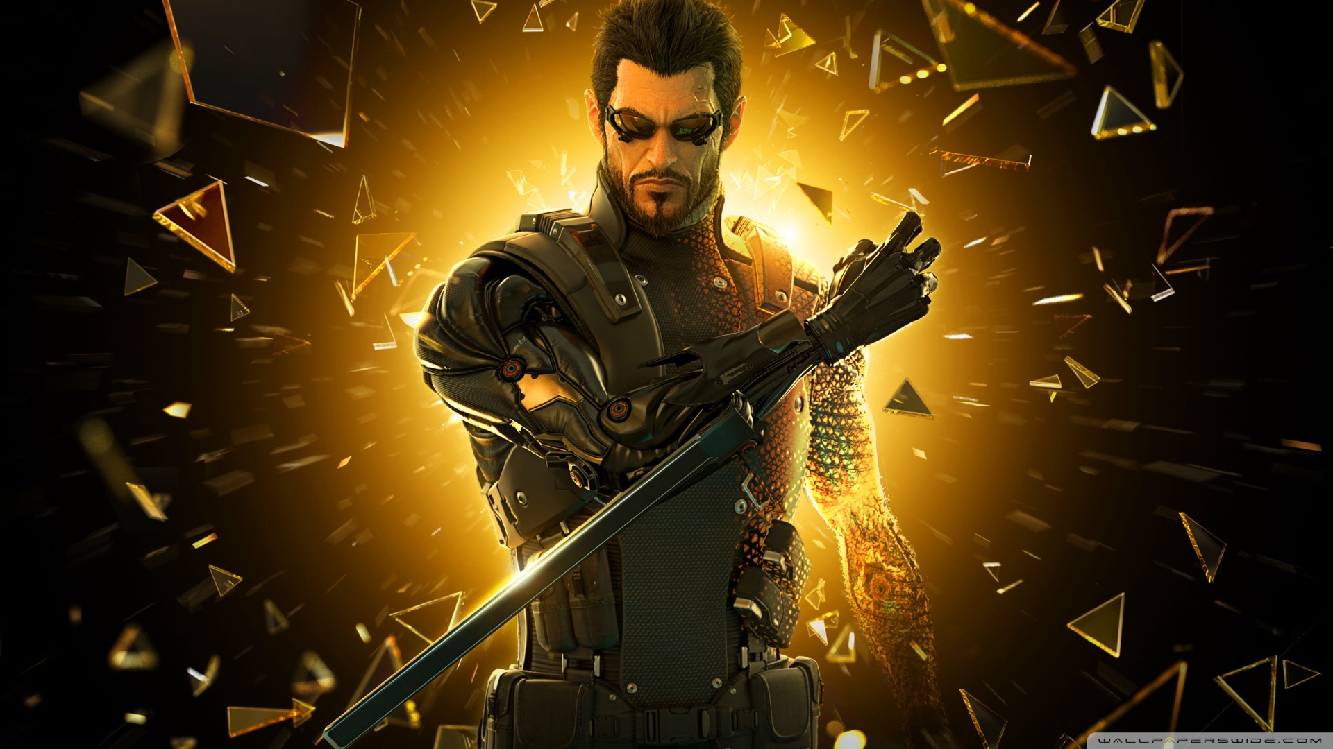 Description: A man holding a sword in front of a black background with gold triangles and triangles around him.
