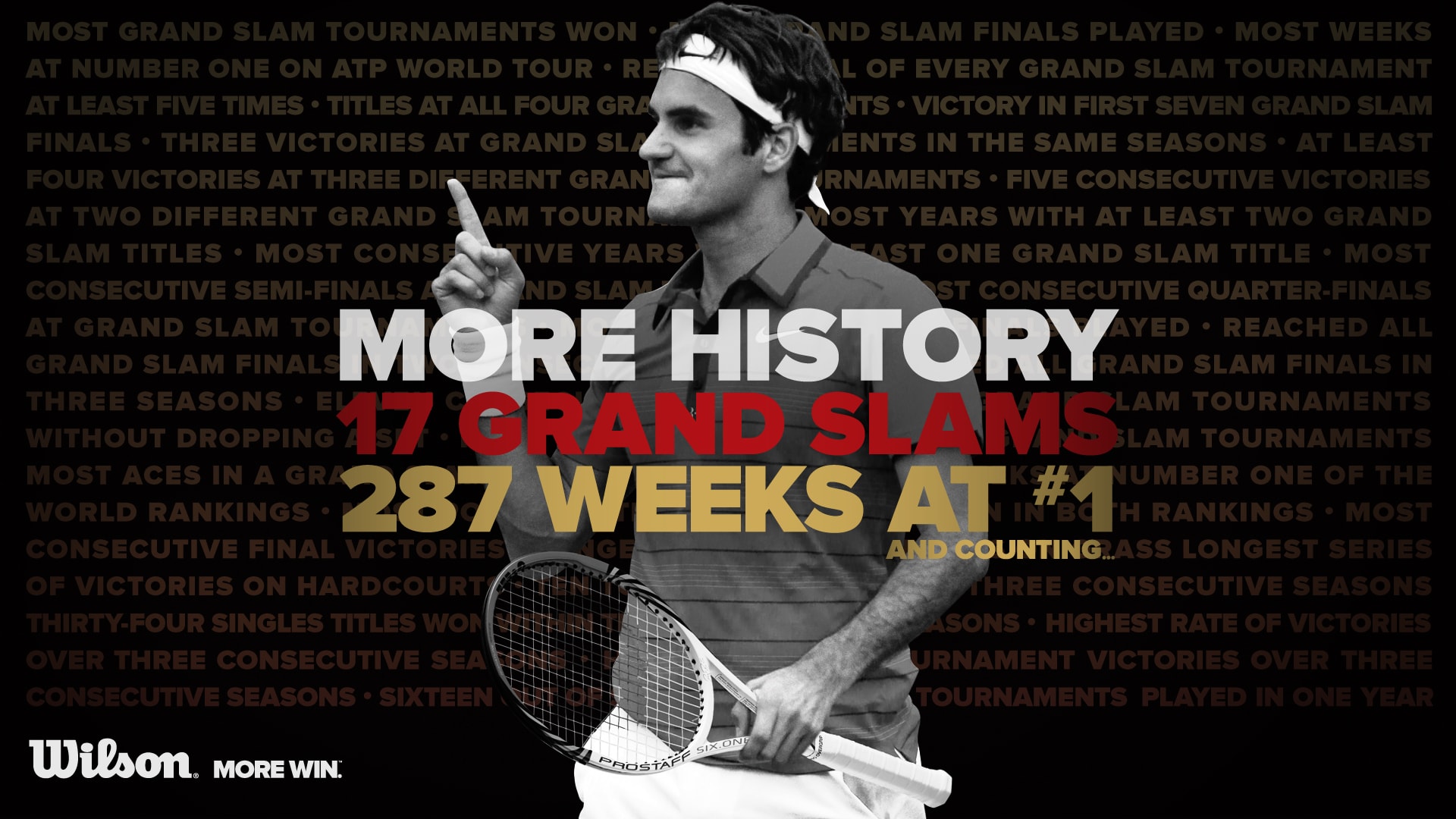 Description: A man holding a tennis racquet on top of a tennis court with words written on it that read more history.