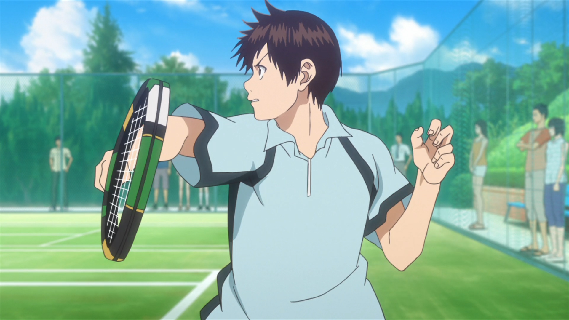 Description: A man holding a tennis racquet on a tennis court with people watching from the stands behind him.