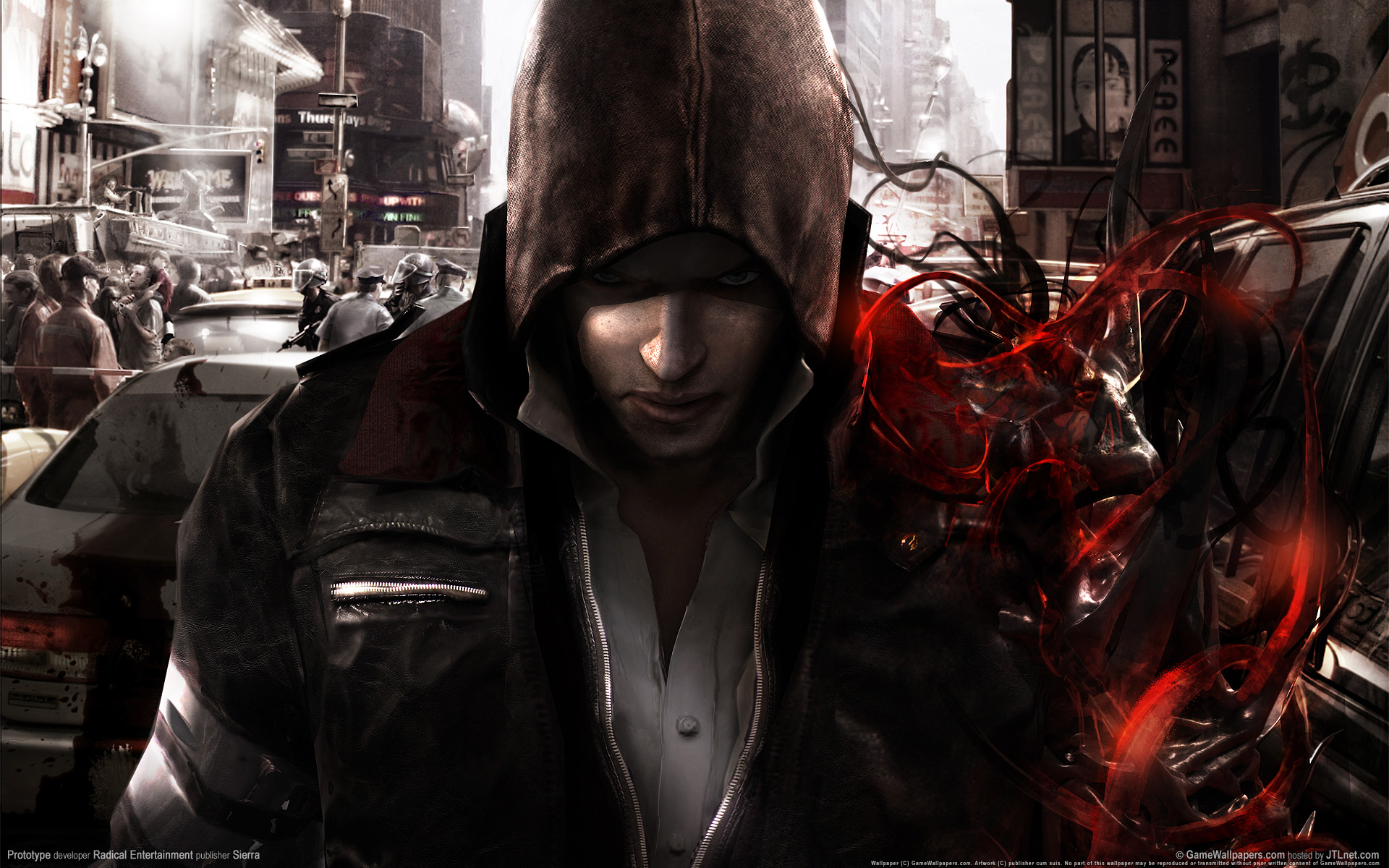 Description: A man in a hooded jacket standing in a city street with a red fireball in his hand and a car in the background.
