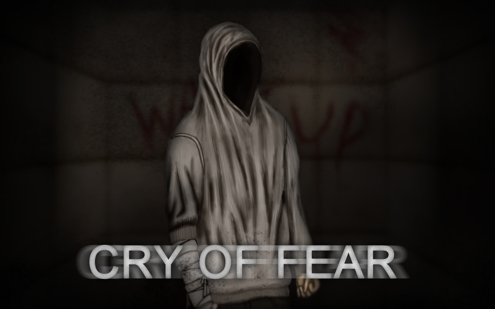 Description: A man in a hooded jacket with the words cry of fear in front of him and a graffiti - covered wall behind him.