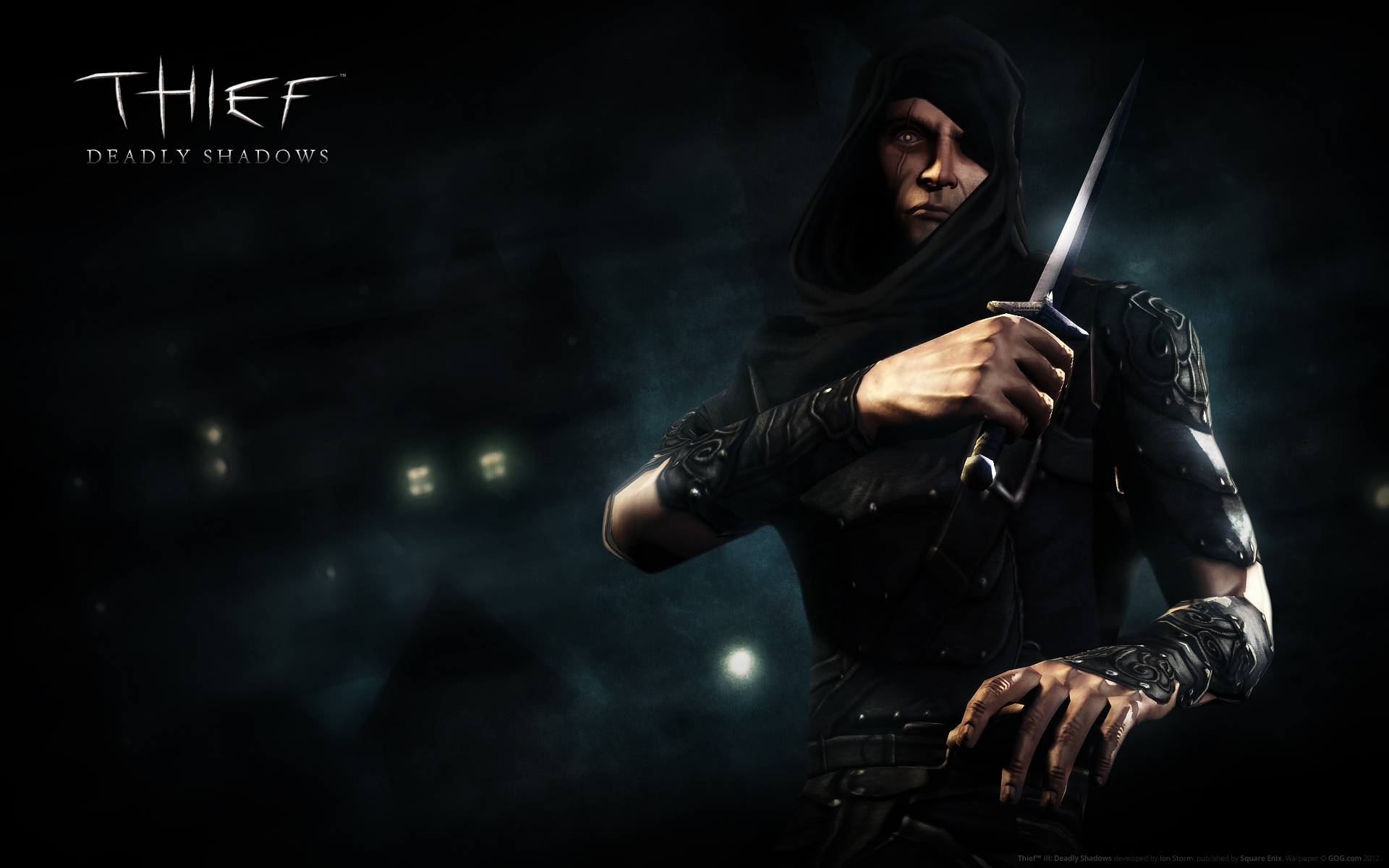 Description: A man in a hooded outfit holding a knife in his hands and looking at the camera with a dark background.