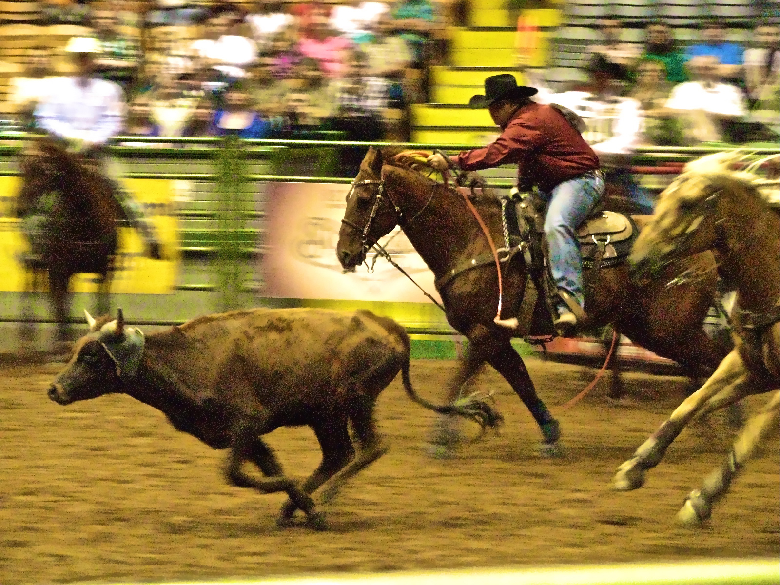 Description: A man riding a horse next to a cow in a rodeo arena with a crowd watching from the stands.