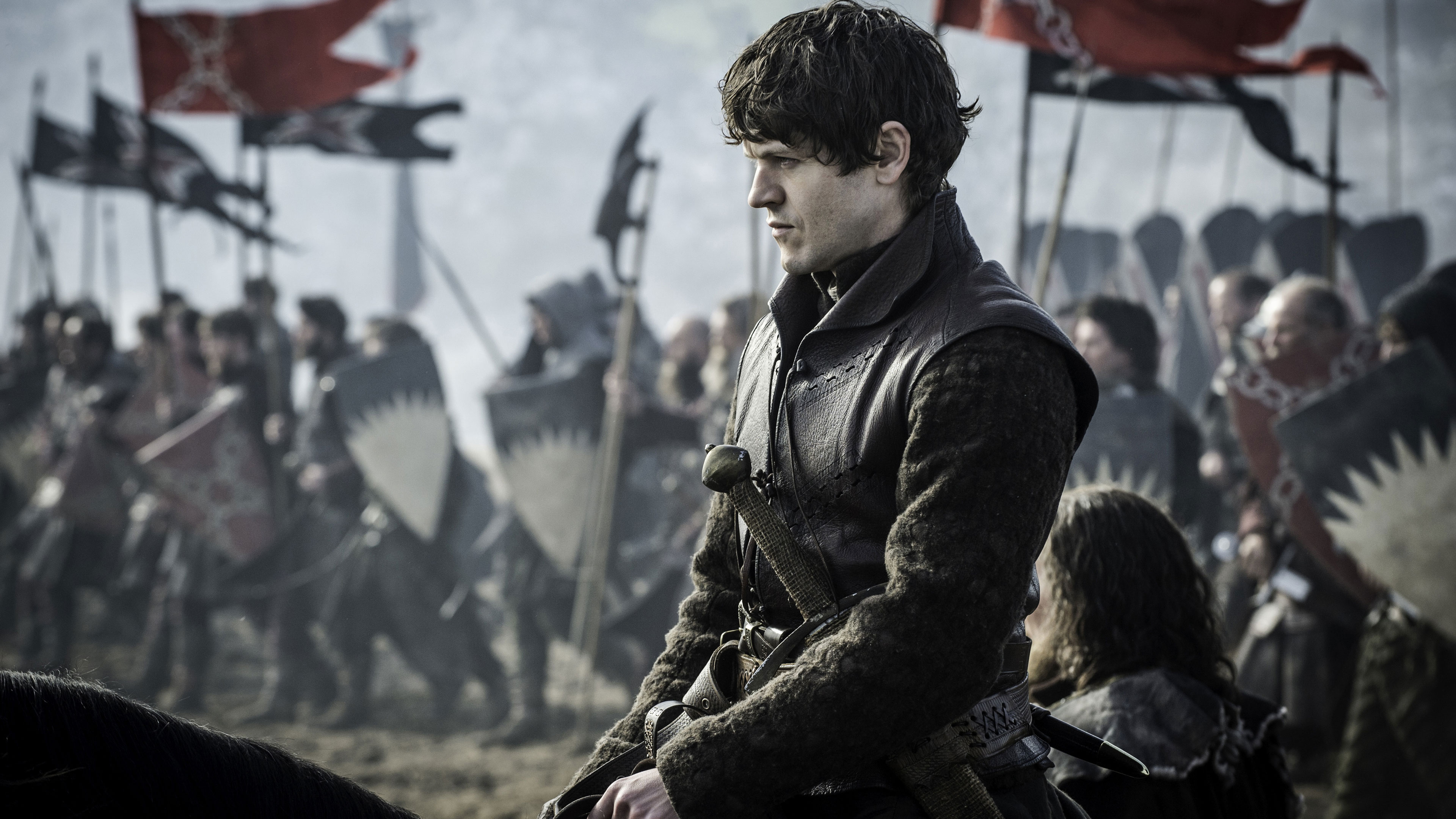 Description: A man on a horse in front of a crowd of people with flags in the background of a battle.