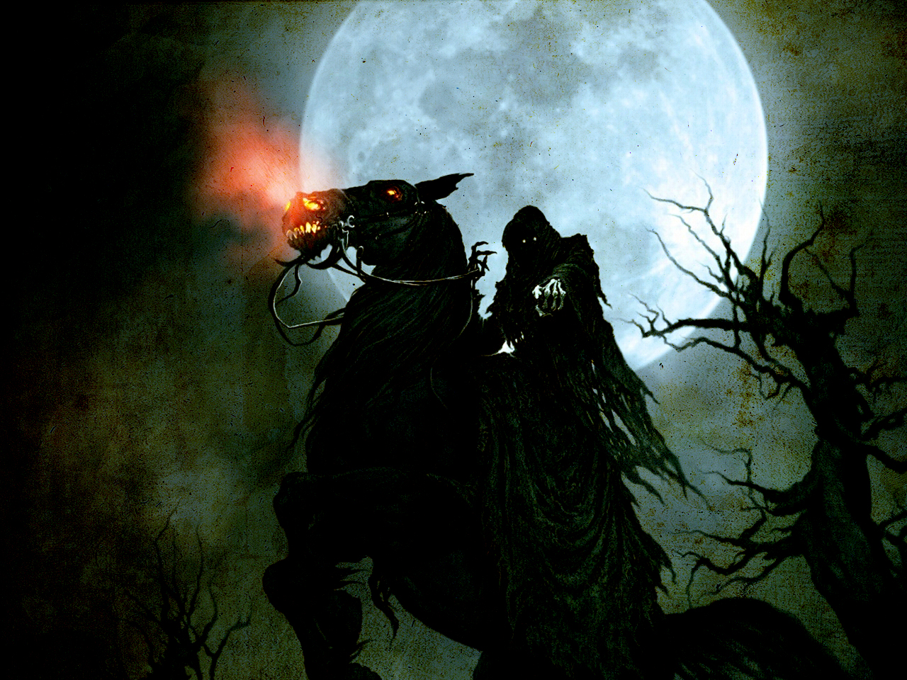 Description: A man riding a horse with a demon on it's back in front of a full moon with trees.