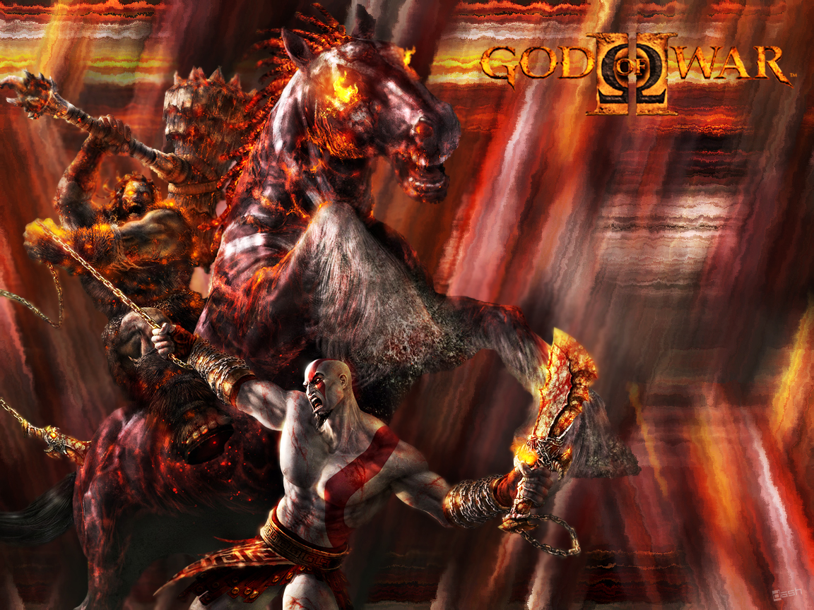 Description: A painting of a man riding a horse next to a demon on a horse with a sword in his hand.