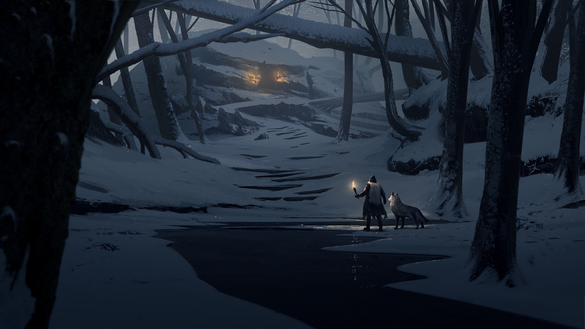 Description: A man riding a horse through a snowy forest at night with a lantern in his hand and a dog on the other side of the path.