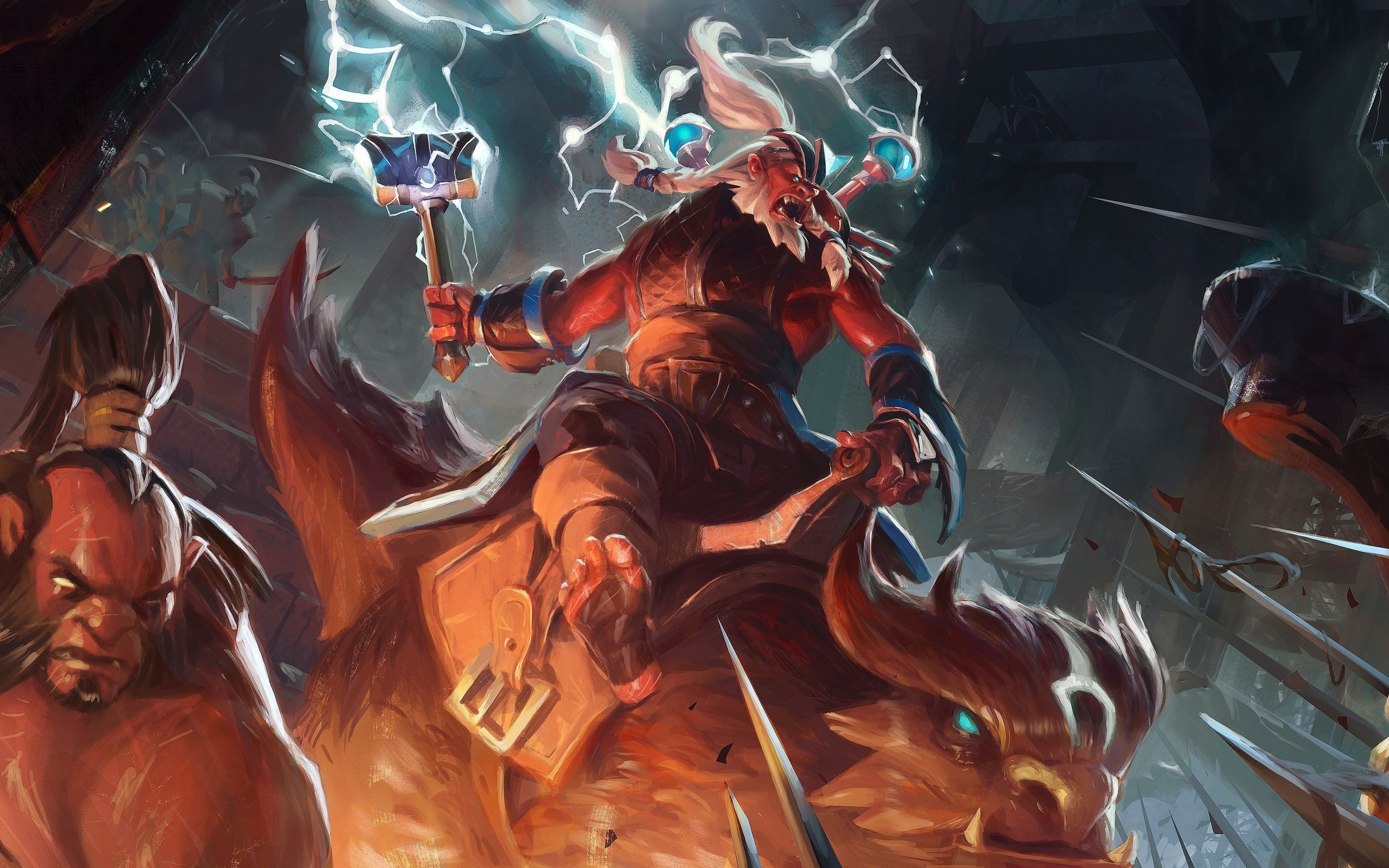 Description: A man riding on the back of a brown horse next to a horse with a sword in its hand.