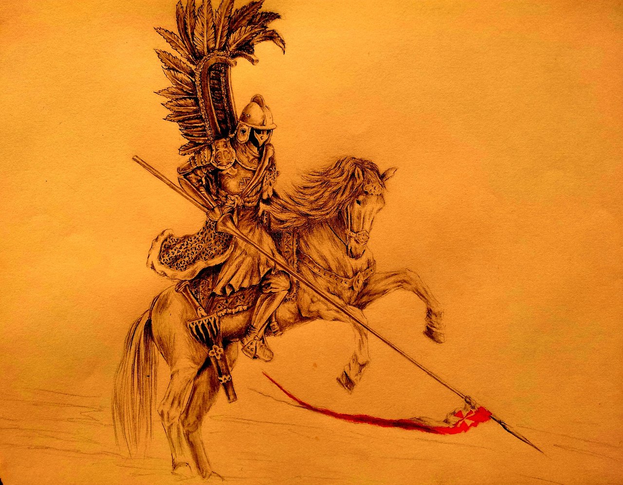 Description: A drawing of a man on a horse with a sword and a spear in his hand and a blood stained red spot on the ground.