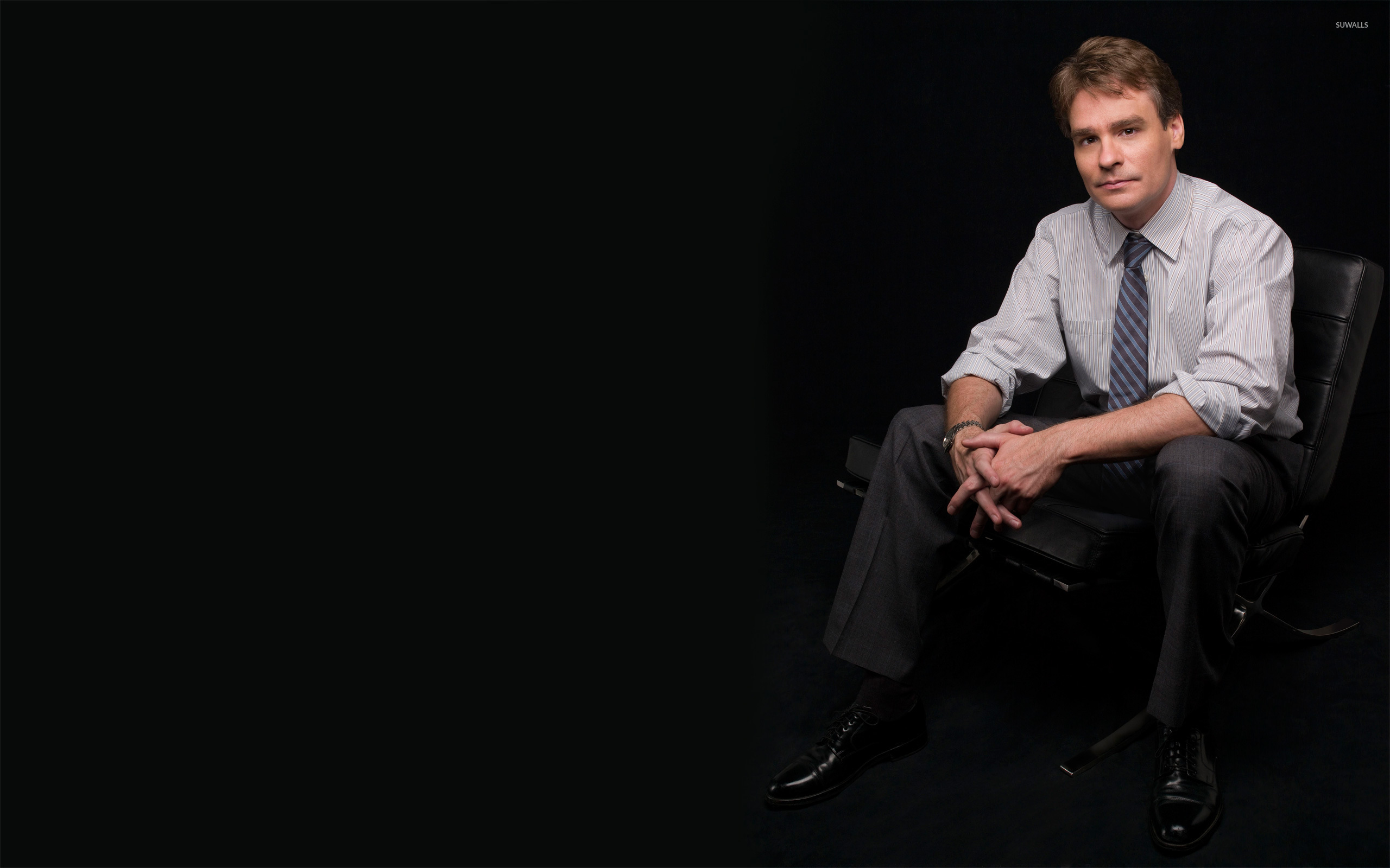 Description: A man in a dress shirt and tie sitting in a chair with his hands on his knees and his legs crossed.