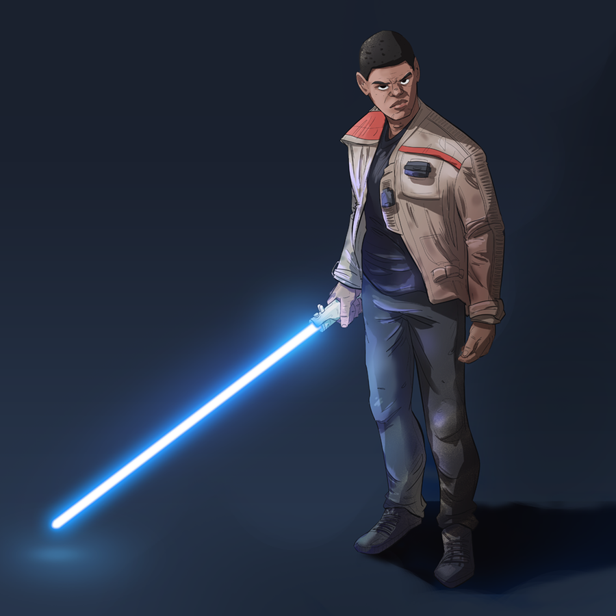 Description: A man in a jacket holding a light saber in his hand and standing in the dark with a blue light behind him.