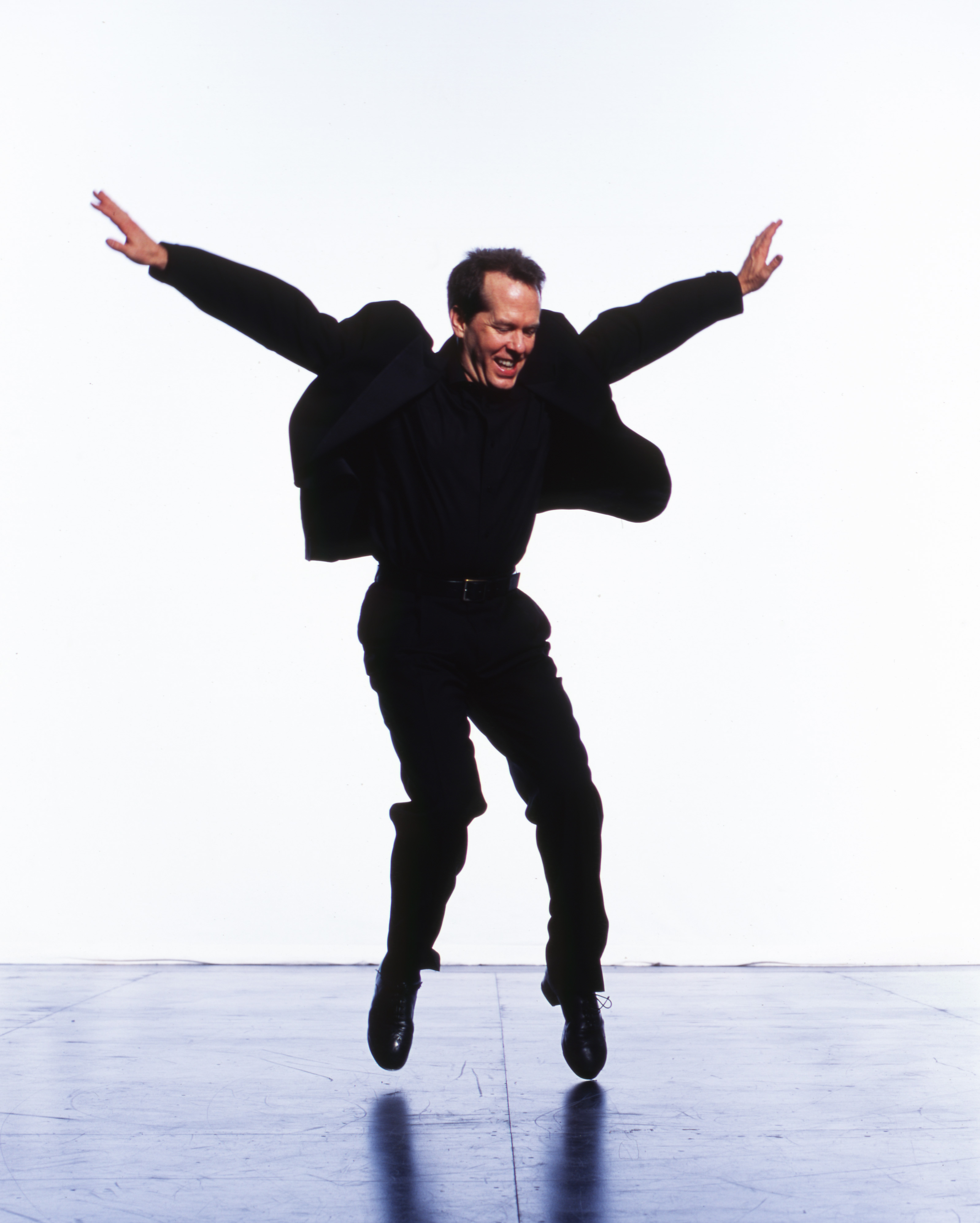 Description: A man in a black suit is jumping in the air with his arms outstretched and his hands out to his sides.