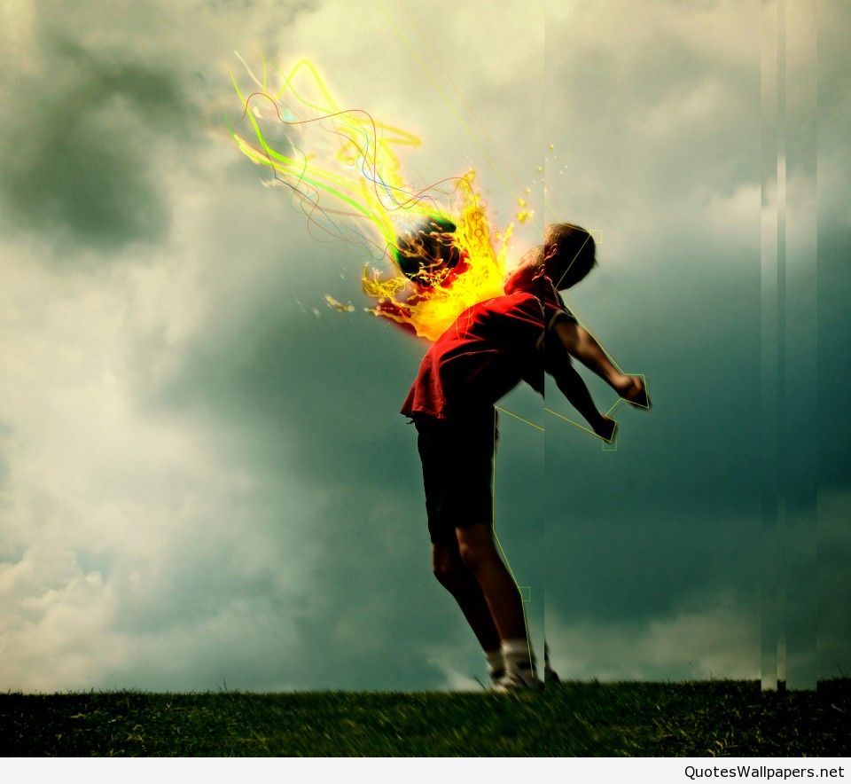 Description: A man is jumping in the air with a fireball in his hand and a cloudy sky behind him.