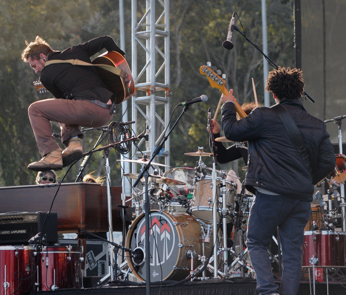 Description: A man jumping up in the air on a guitar while another man plays on a guitar behind him on stage.