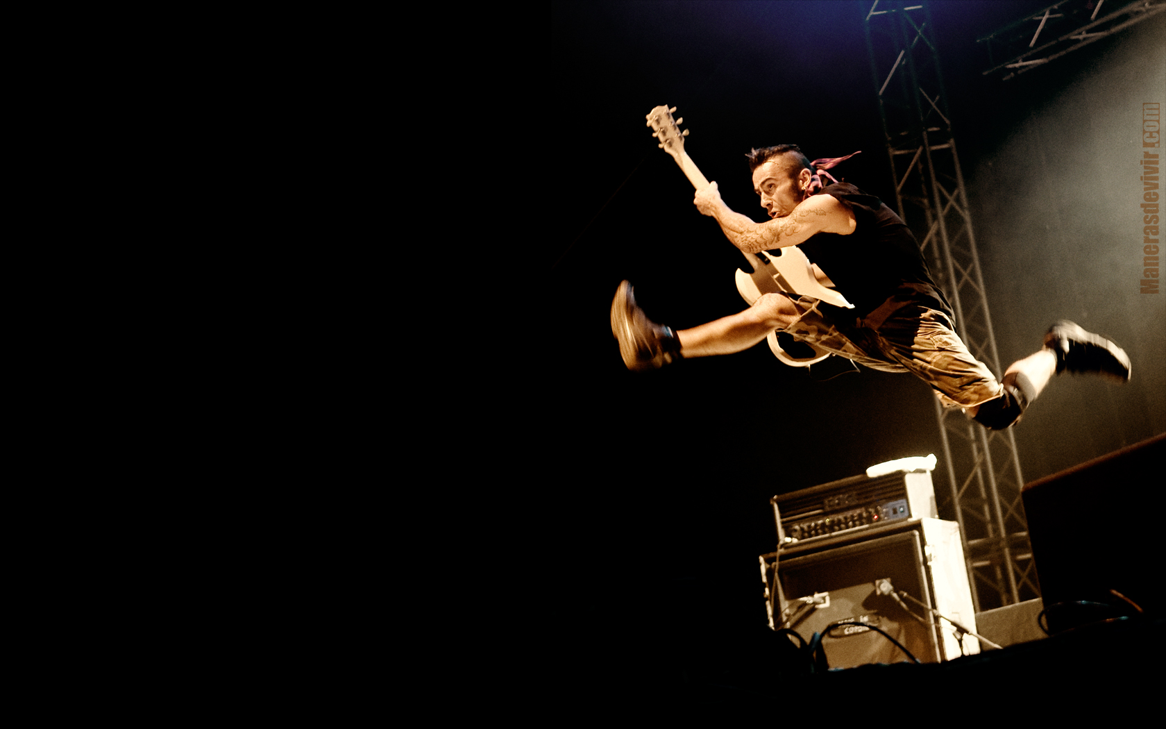 Description: A man jumping in the air on a stage with a guitar in his hand and a microphone in his other hand.