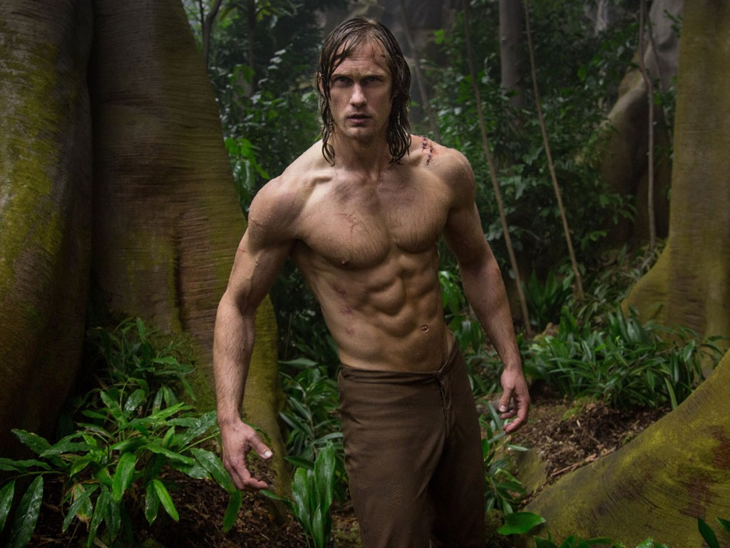 Description: A man in the jungle with no shirt on standing in the woods with trees and plants around him.