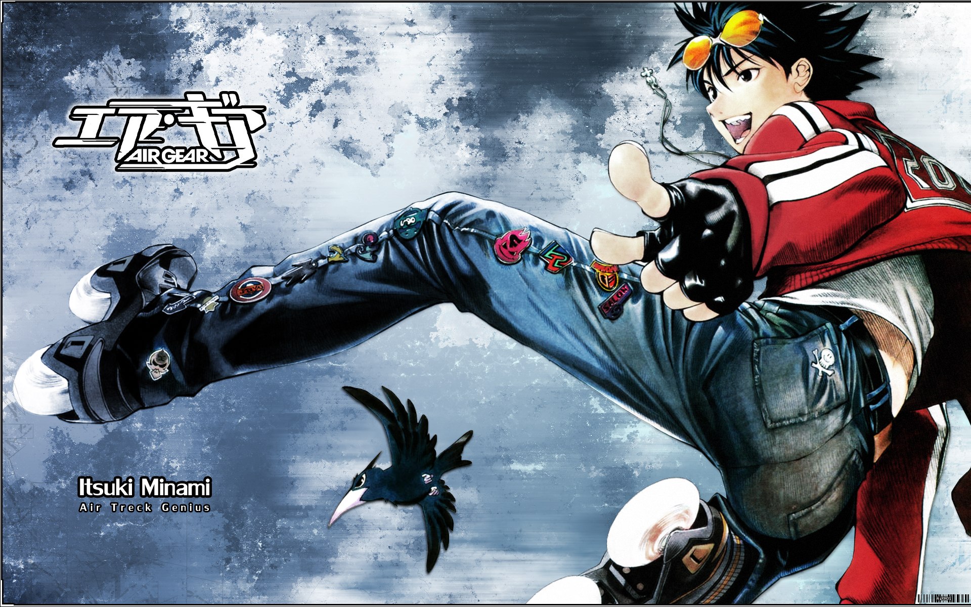 Description: A man is doing a kick with a bird flying by him and another man is holding him out with his hand.