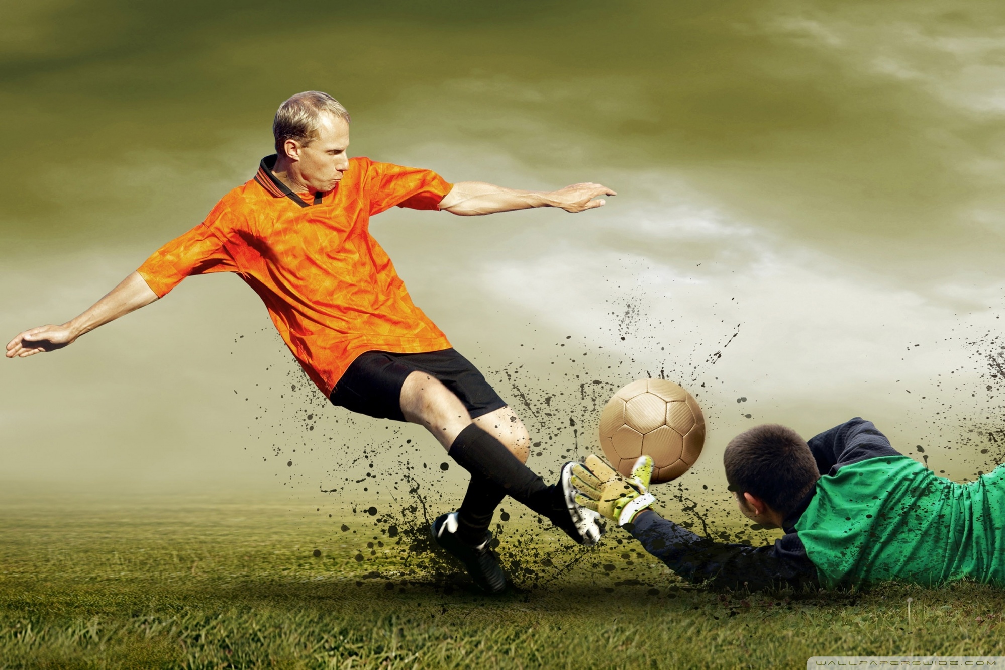 Description: A man kicking a soccer ball next to another man on a field of grass with a cloudy sky in the background.