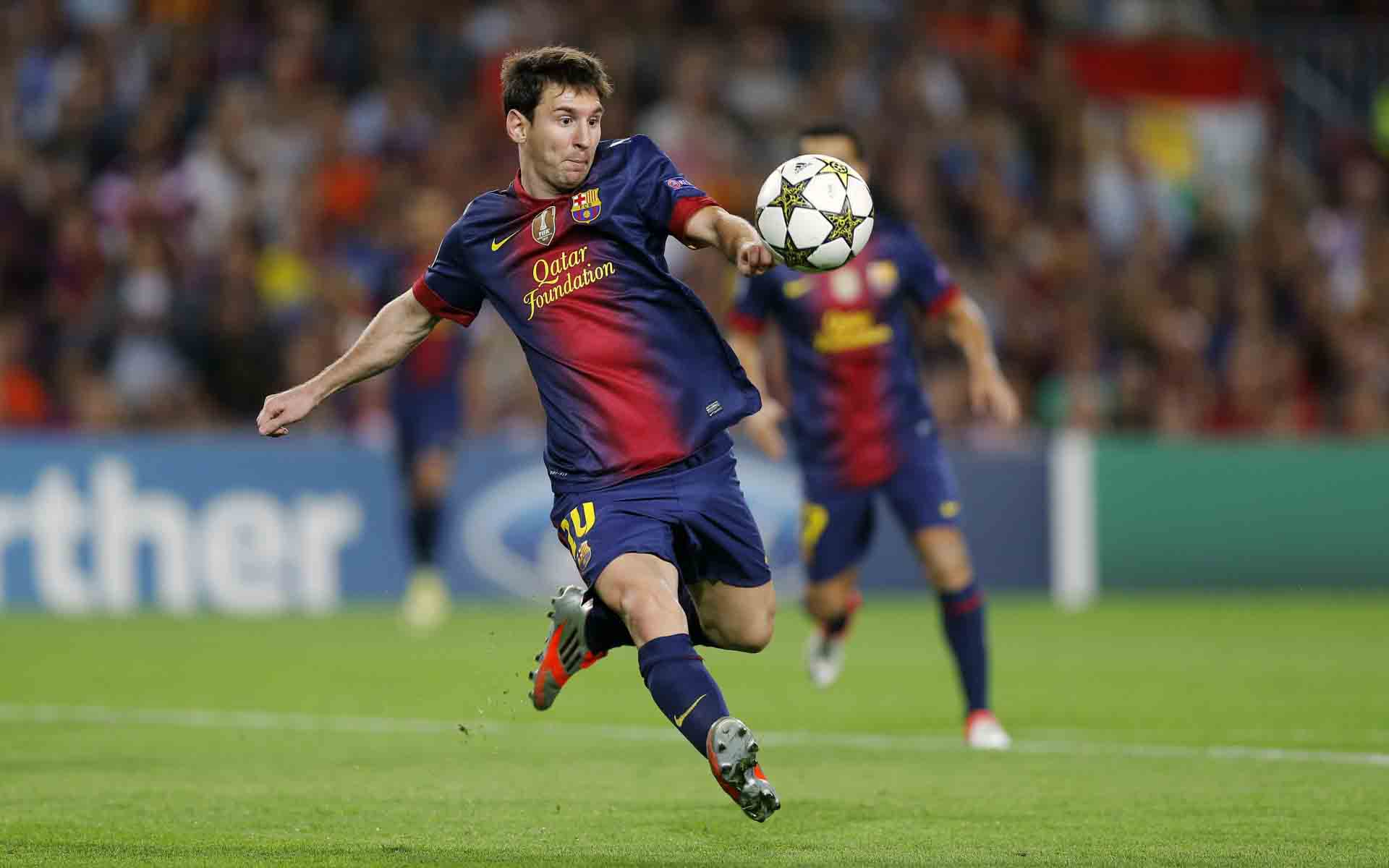 Description: A man kicking a soccer ball on a field with a crowd watching him from the sidelines watching him.