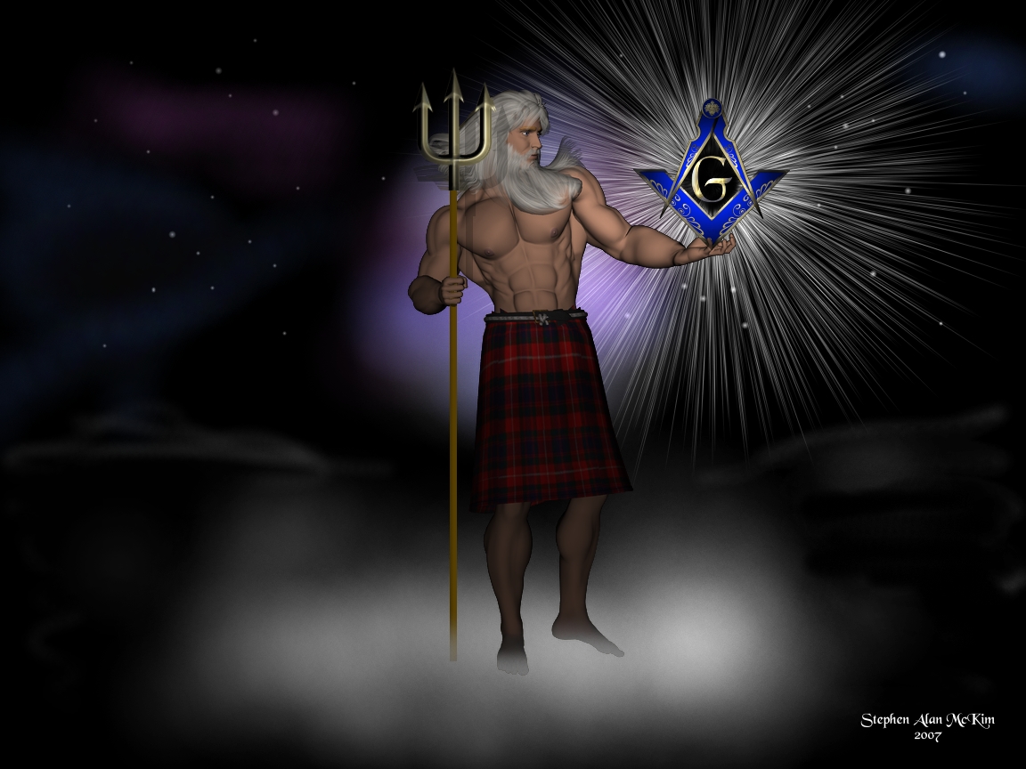 Description: A man in a kilt holding a sword and a star in the background with a purple light behind him.