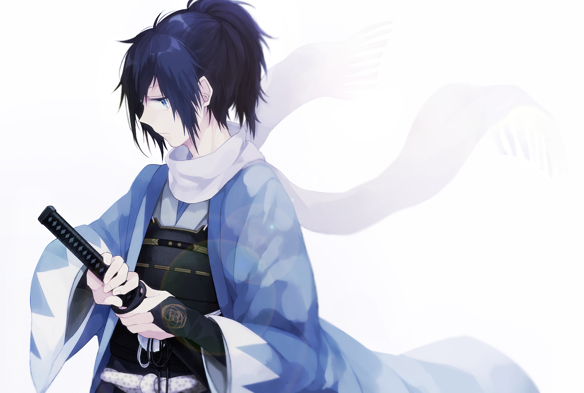 Description: A man in a kimono holding a sword in his hand and a white background behind him is a white background.