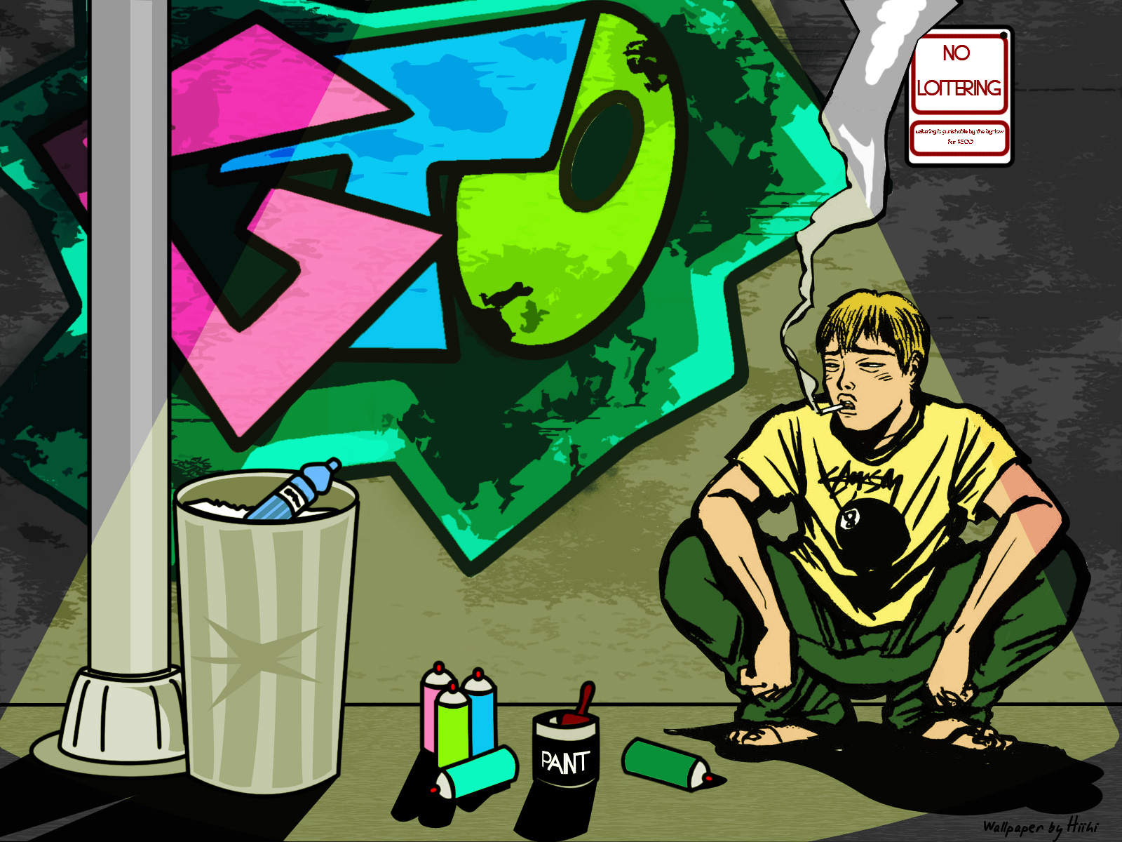 Description: A man kneeling down next to a trash can and a graffiti wall with a green alien on it's face.