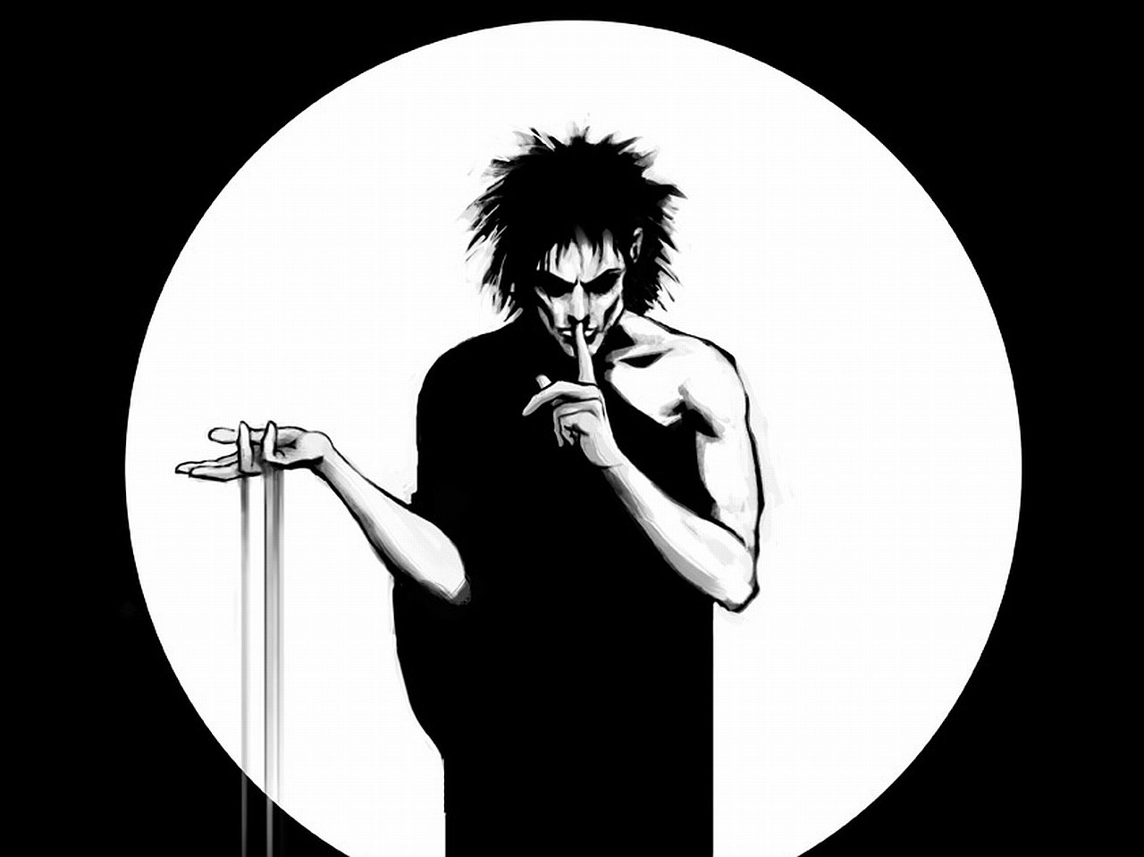 Description: A man with a knife in his hand standing in front of a white circle with a black background and a black and white image of a man with a knife in his hand.