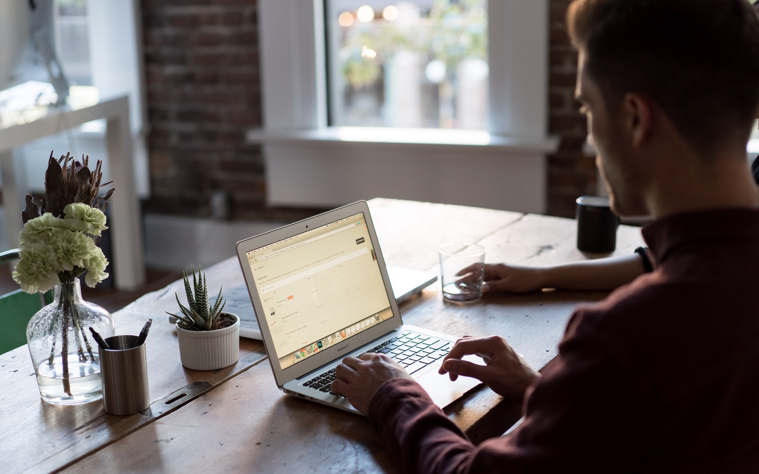 Description: A man sitting at a table using a laptop computer with a plant in the background on the table and a potted plant on the table.
