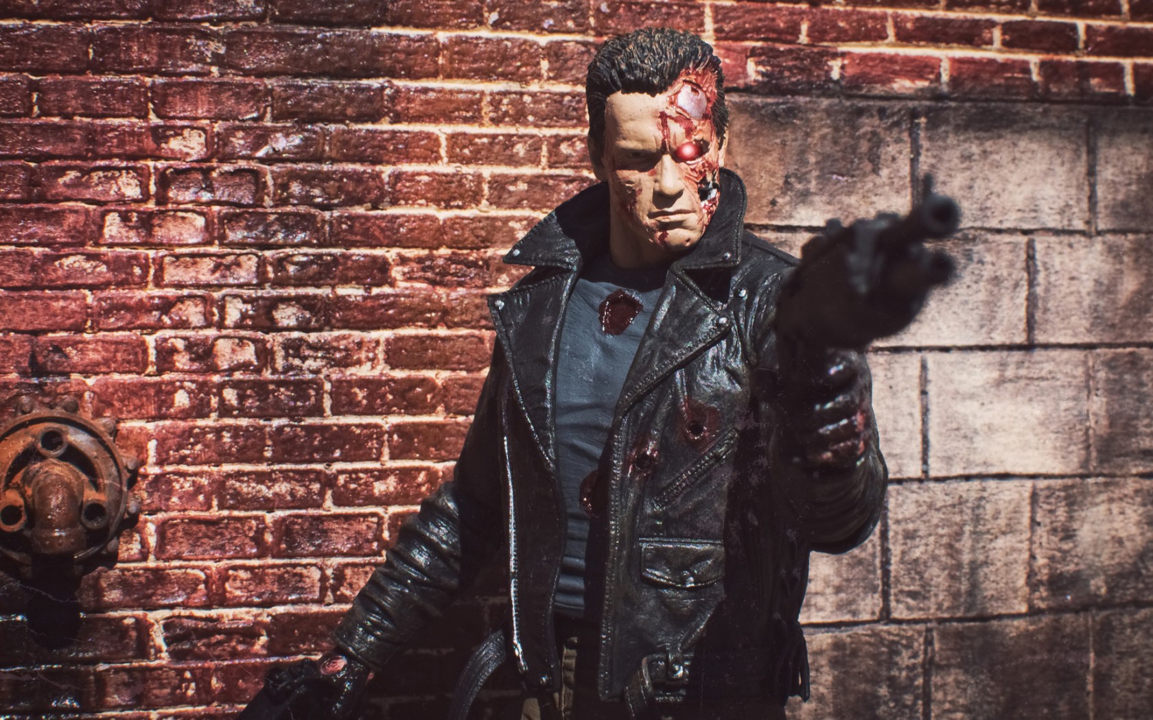 Description: A man in a leather jacket pointing a gun at something in front of a brick wall with a dog.