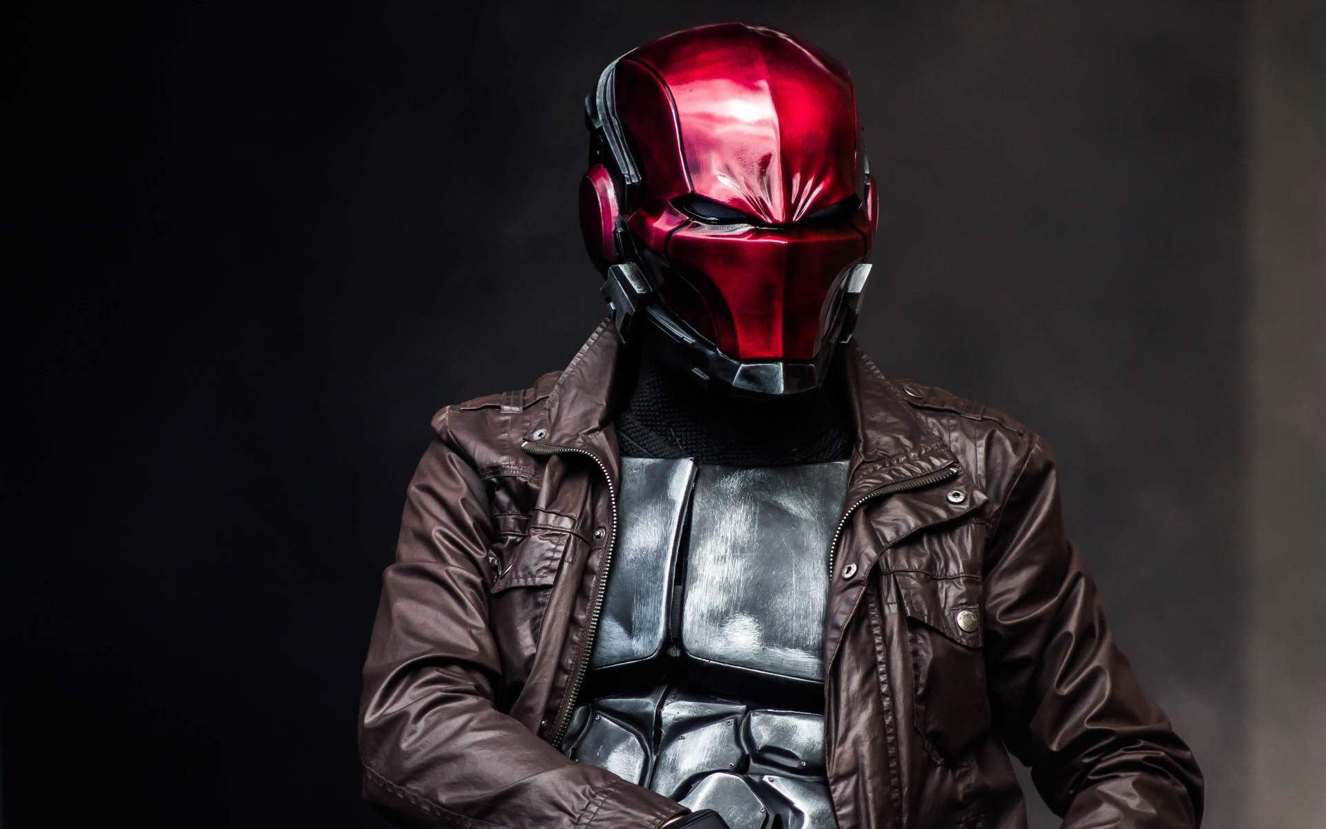Description: A man in a leather jacket and helmet with a gun in his hand and a red helmet on his head.