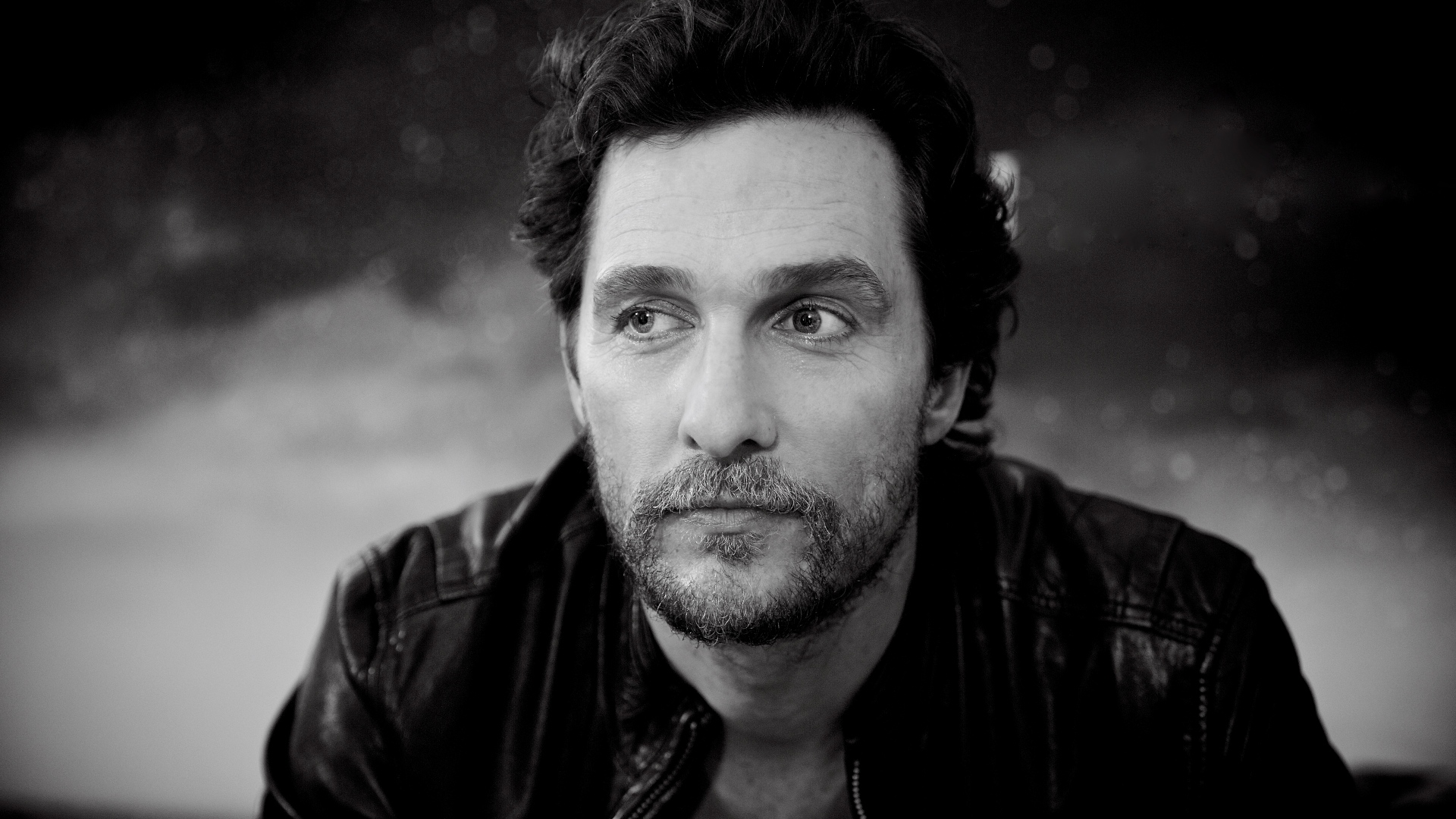 Description: A man with a leather jacket on posing for a picture with a black background and a blurry background.
