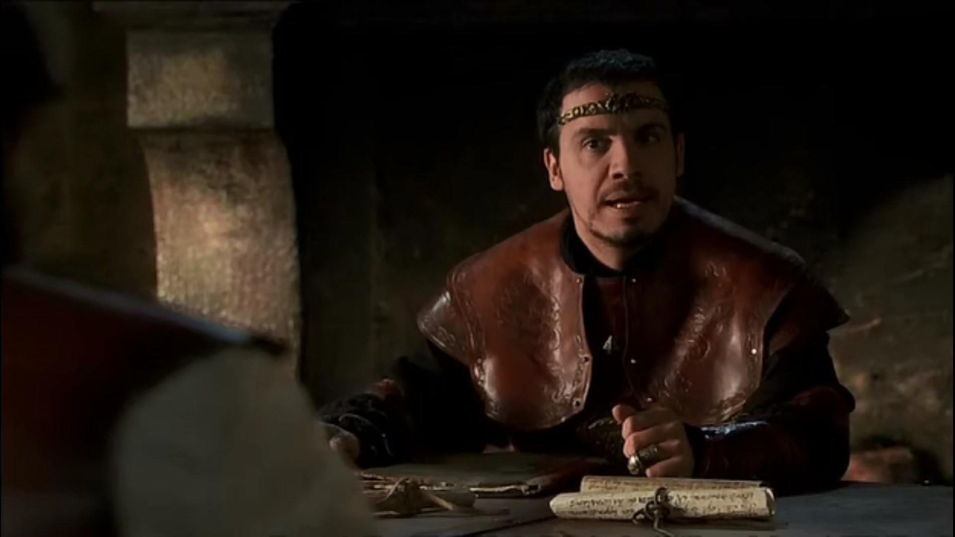 Description: A man in a leather jacket sitting at a table with a knife and a piece of bread in his hand.