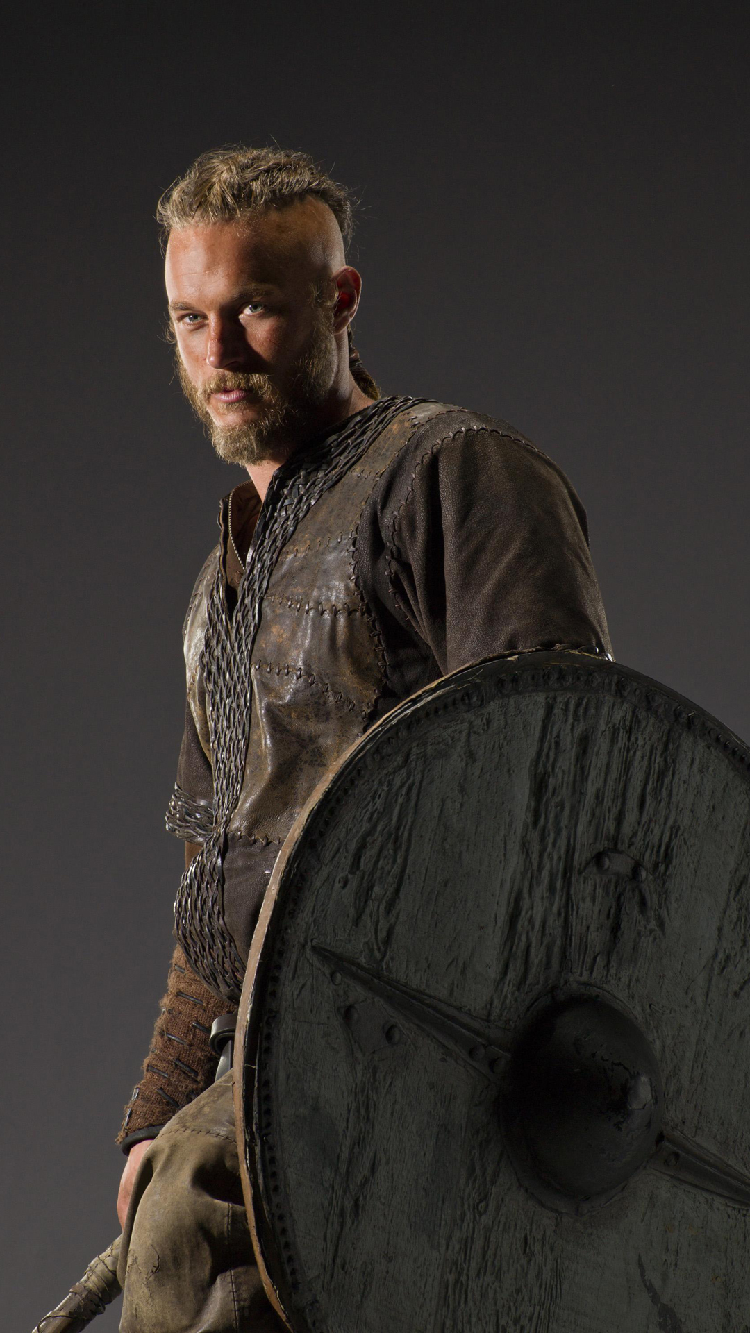 Description: A man in a leather outfit holding a large shield and a sword in his hand.