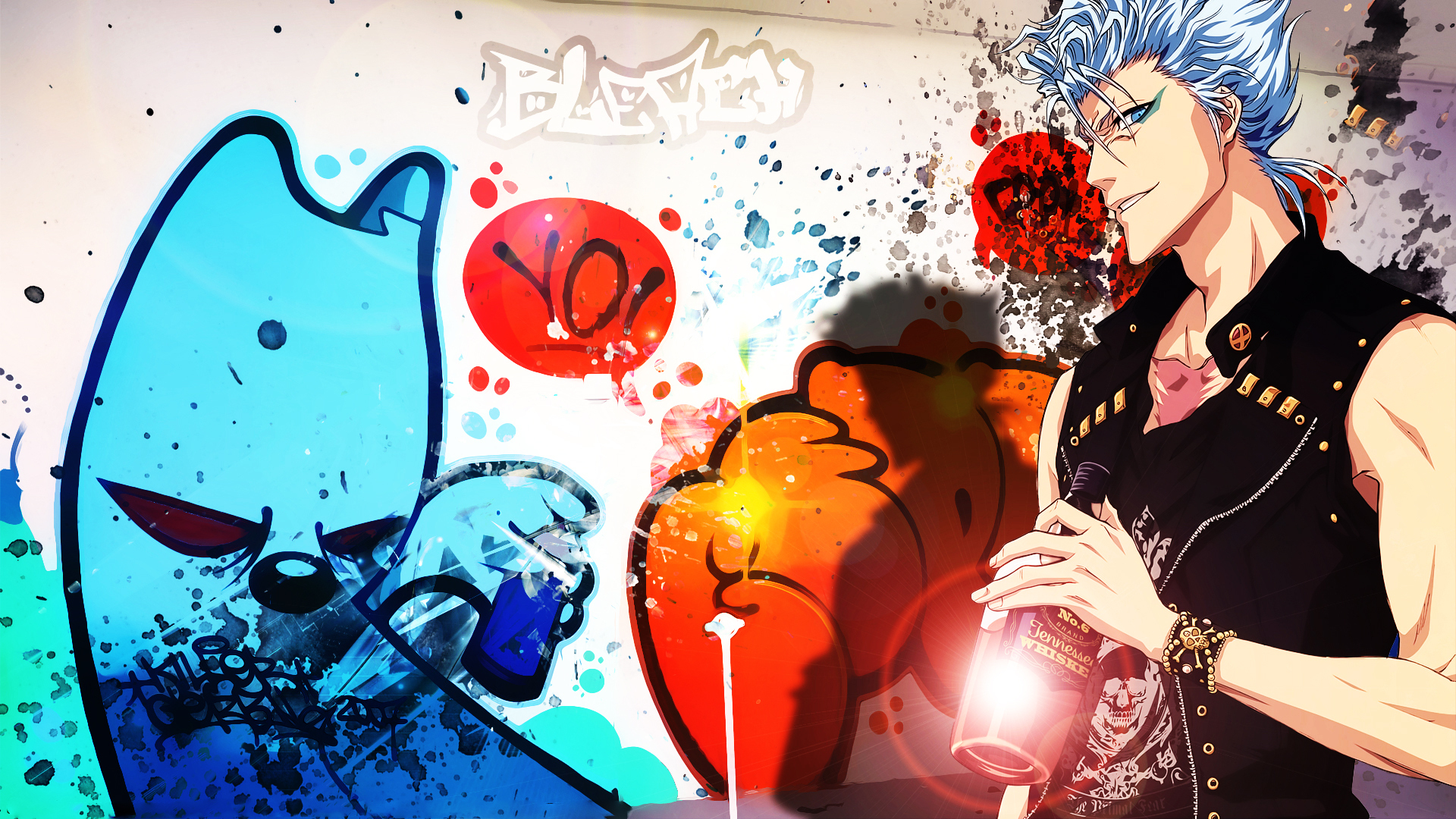 Description: A man holding a light in front of a graffiti wall with a cat on it's face and a cat on his chest.