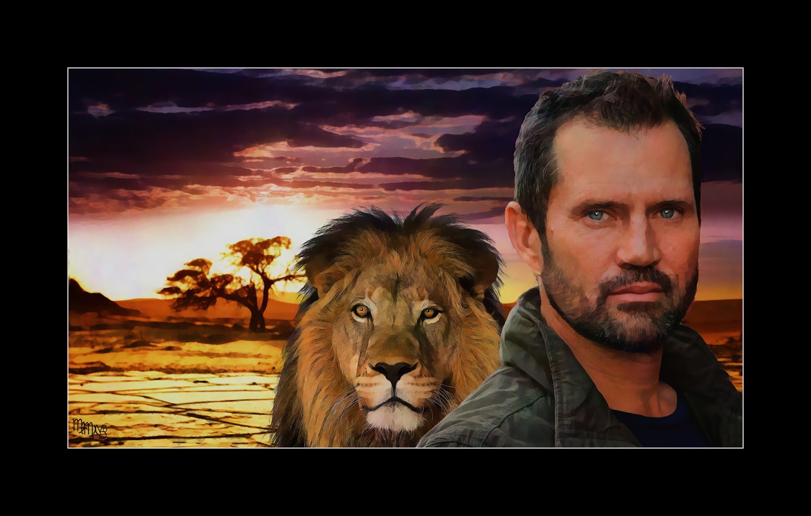 Description: A man with a lion on his shoulder and a picture of a lion on his shoulder with a sunset in the background.
