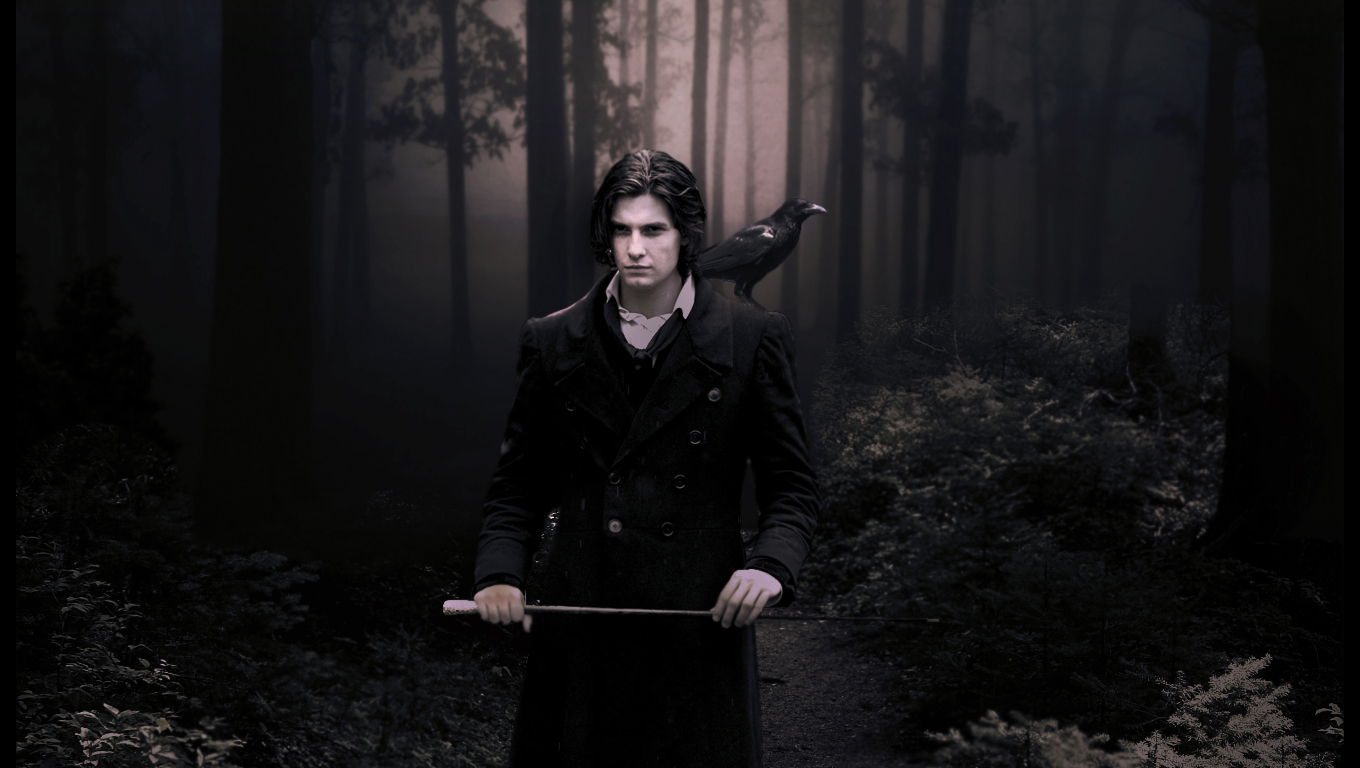 Description: A man in a long coat holding a stick in a forest with a crow on it's shoulder.