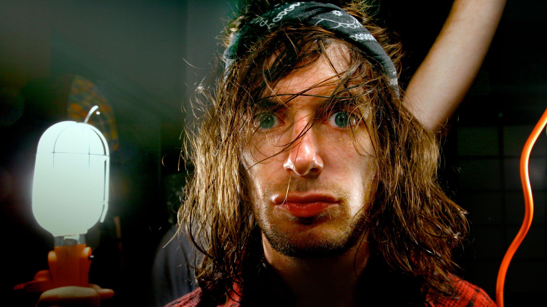 Description: A man with long hair and a bandana on his head is looking at the camera with a mirror in the background.
