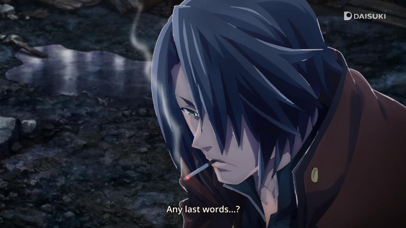 Description: A man with long hair and a cigarette in his mouth in a video game with a caption that reads.