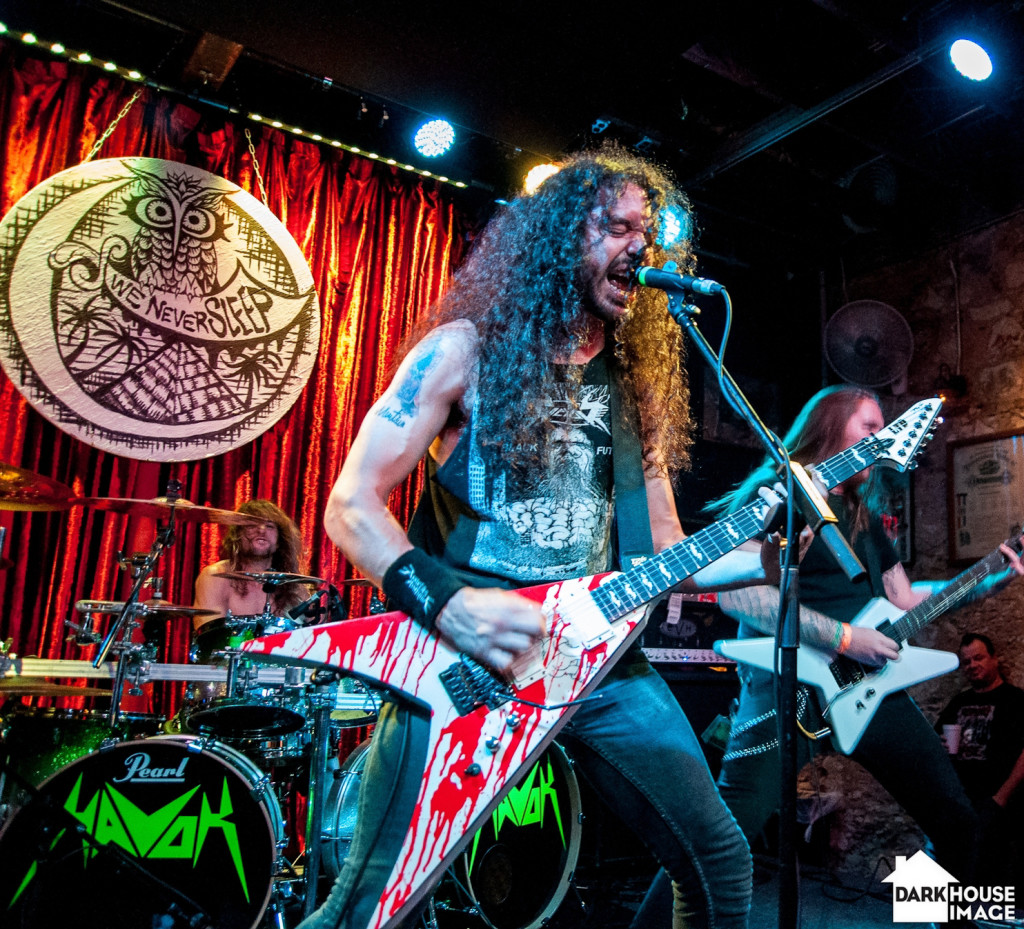 Description: A man with long hair playing a guitar on stage with other musicians in the background and a red curtain.