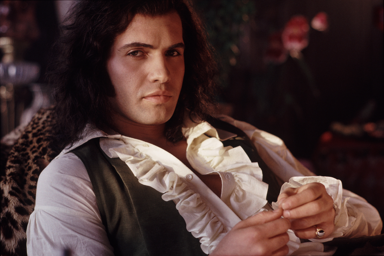 Description: A man with long hair and a ring on his finger holding a cup of coffee in his hand and looking at the camera.