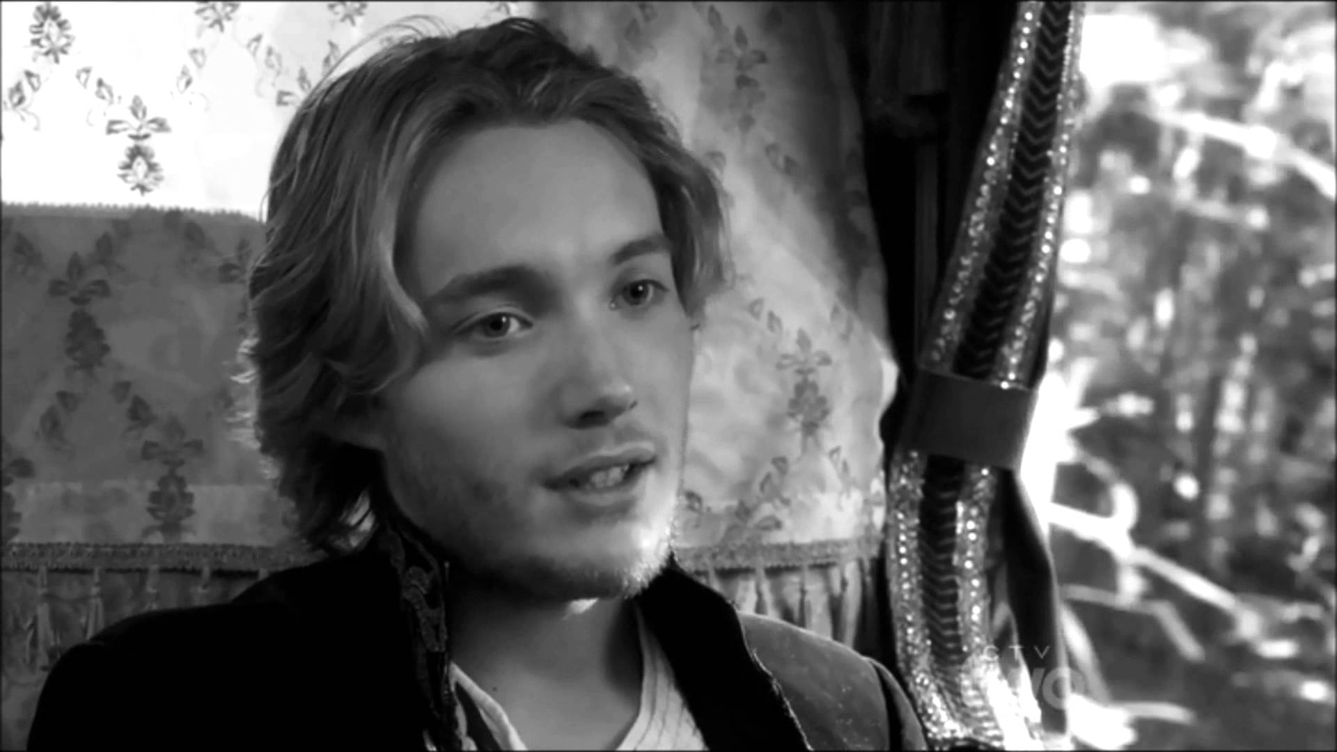 Description: A man with long hair sitting in a chair with a curtain behind him and a curtain behind him with a curtain behind him.