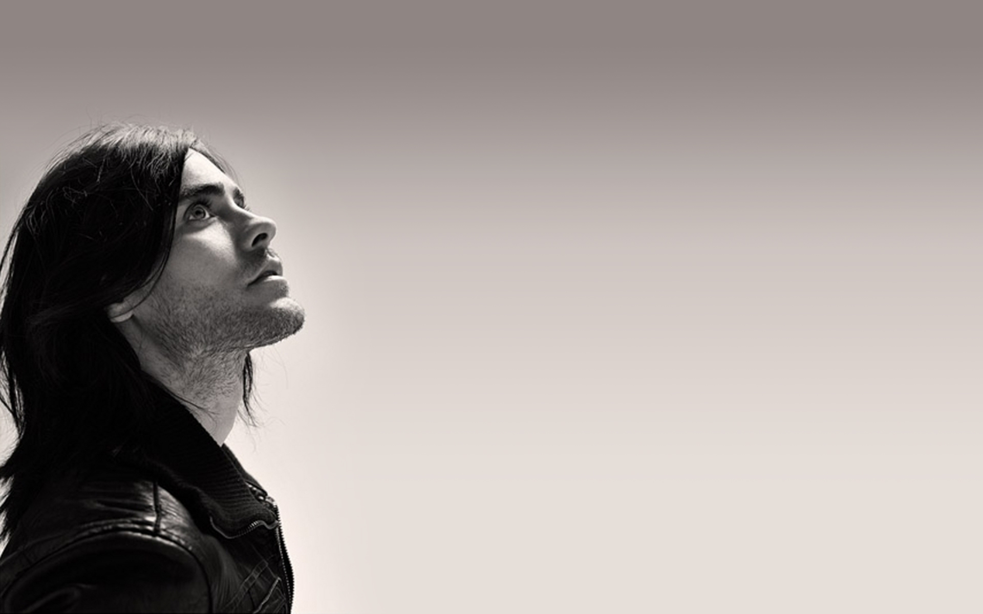 Description: A man with long hair and a leather jacket looking up at something in the sky with his eyes closed.