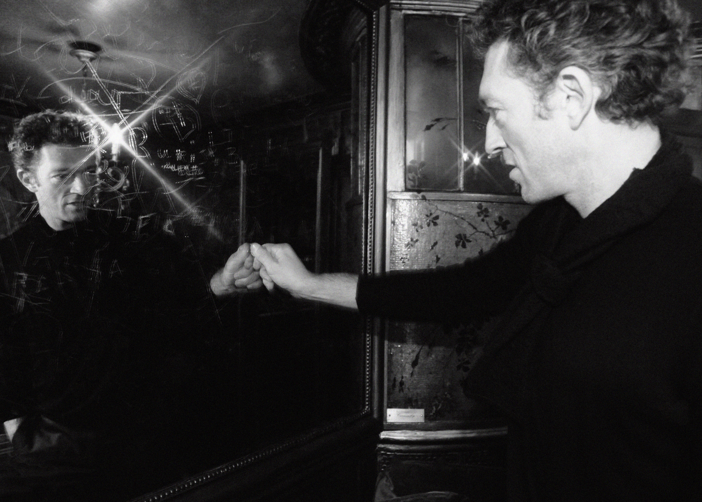 Description: A man is looking at himself in the mirror while he is brushing his teeth with a toothbrush in his hand.