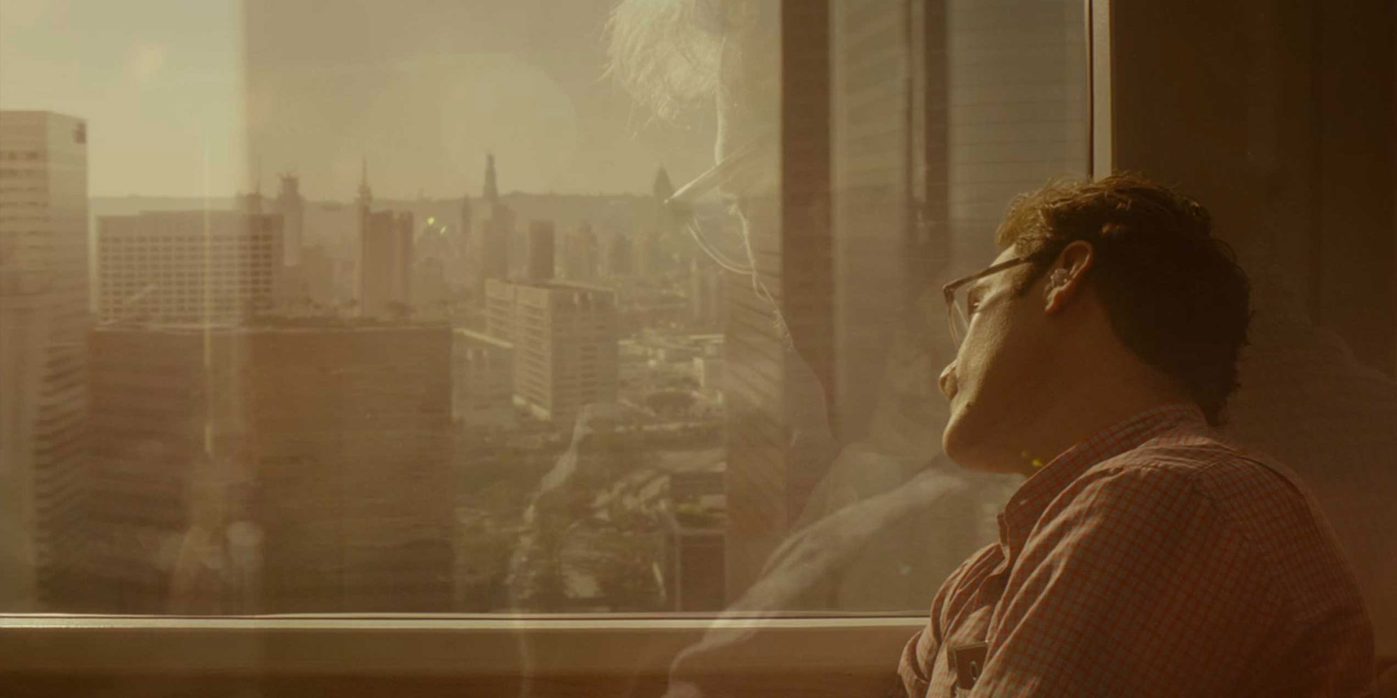 Description: A man looking out a window at a city skyline in the distance with buildings in the background and a person sitting on a bench.