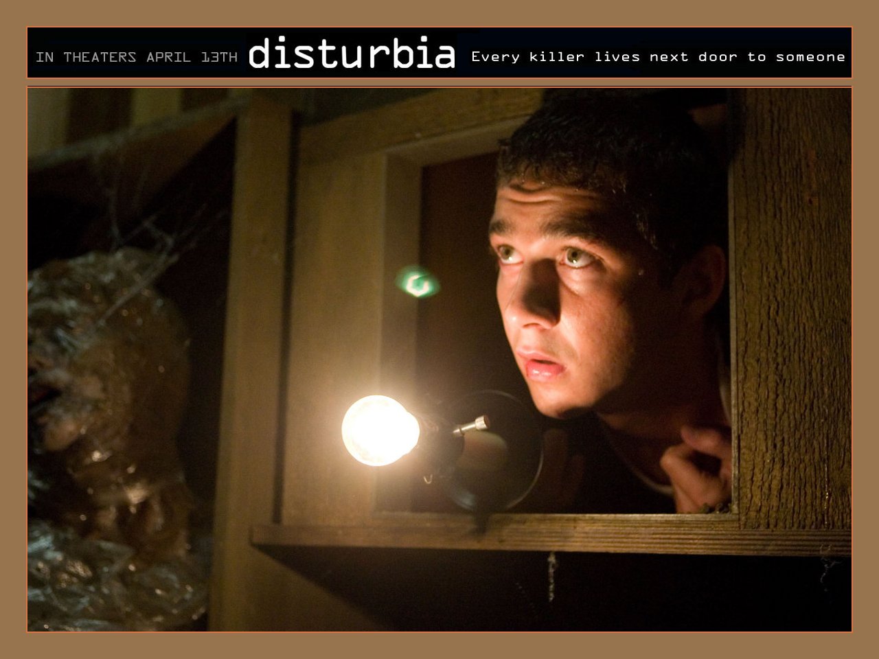 Description: A man looking out of a window at a light in the dark with a creepy look on his face.