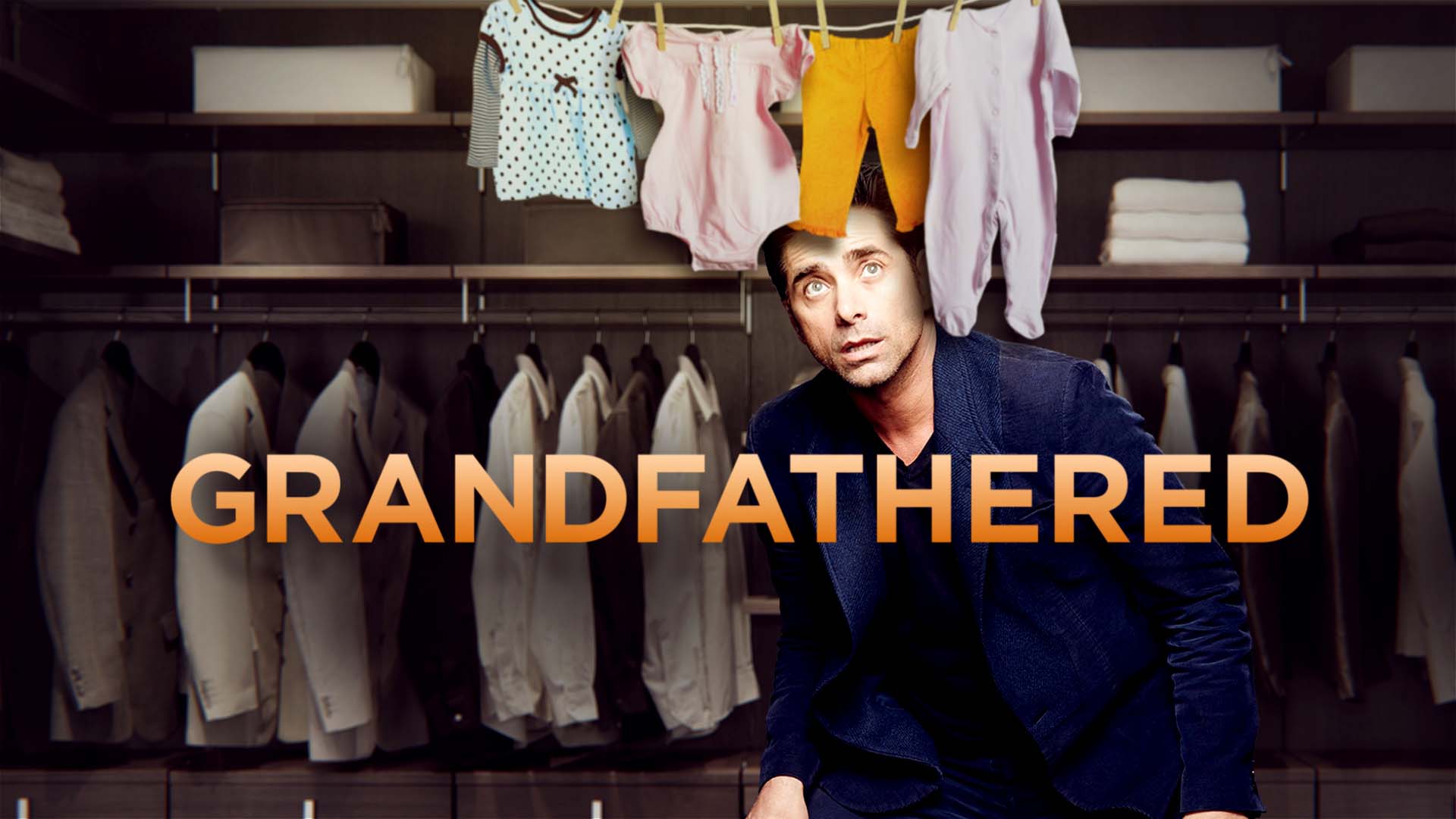 Description: A man is looking up at a rack of shirts and pants with the words grandfathered above him in a shop.