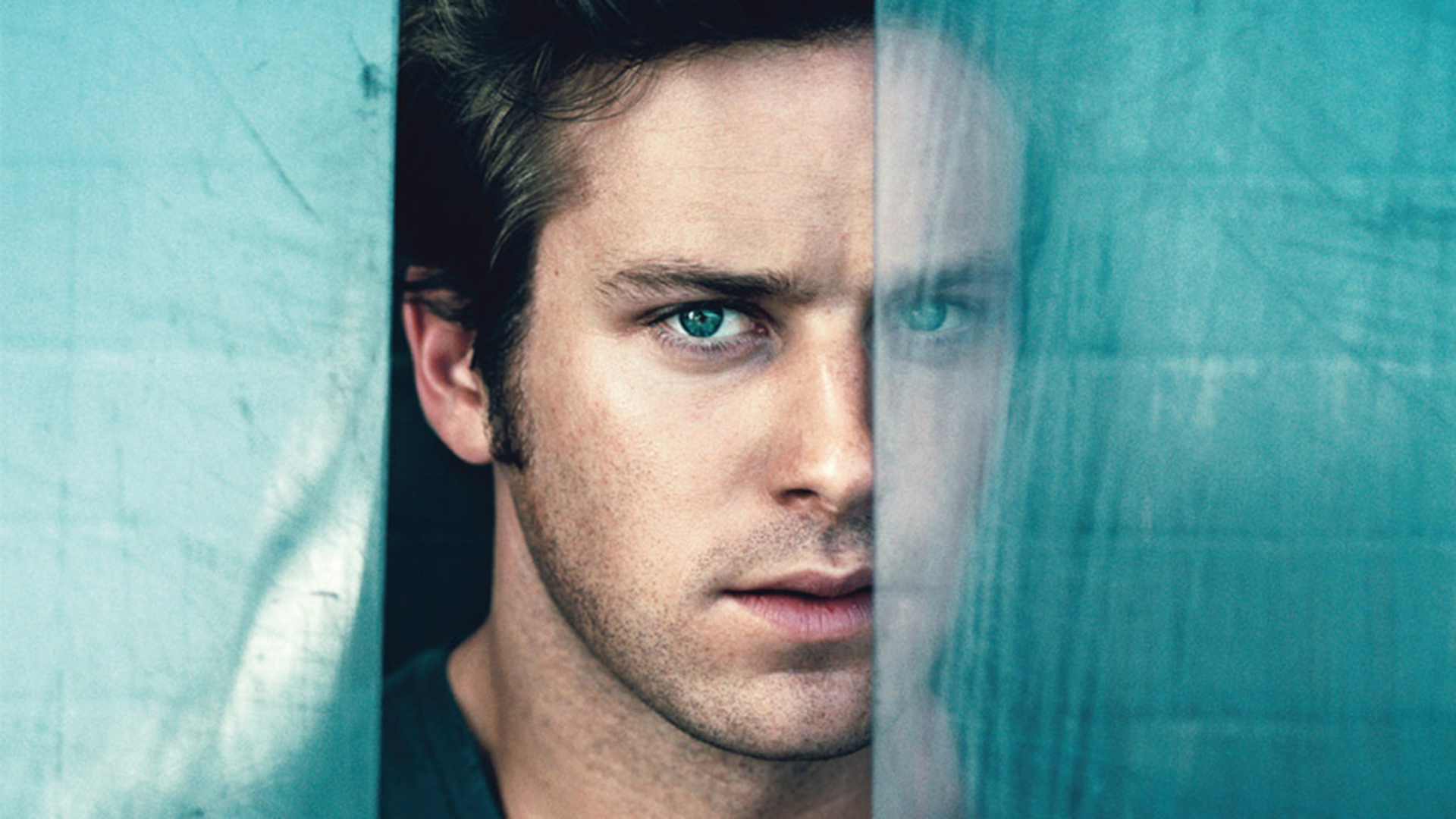 Description: A man looking out of a window with a blue background and a green wall behind him with a blue eye.