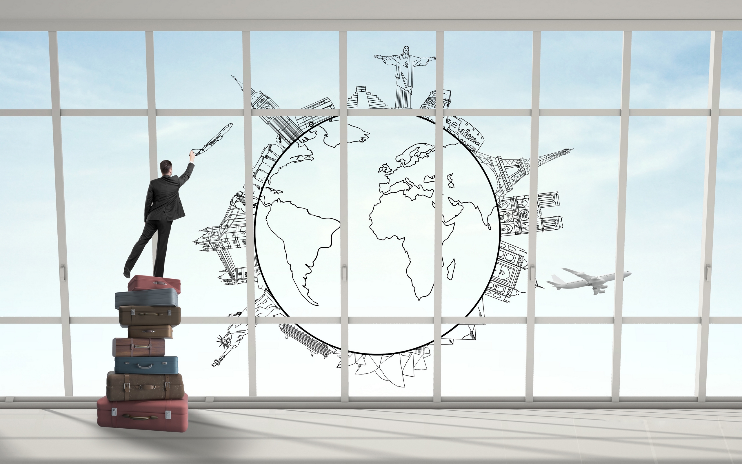 Description: A man standing on a stack of luggage in front of a window with a drawing of a plane on it.