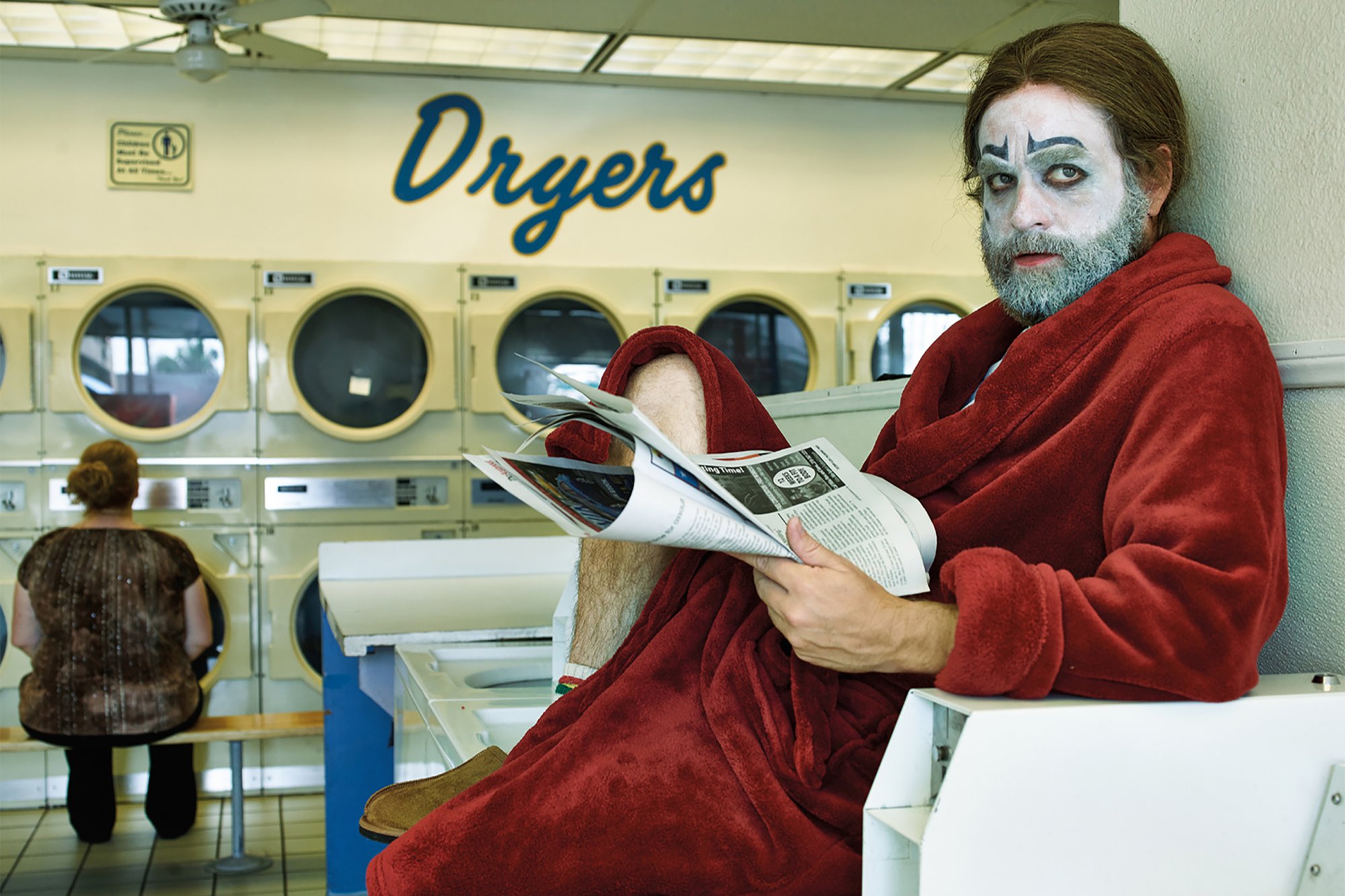 Description: A man with makeup on his face and a newspaper in his hand sitting in a washroom with a woman in the background.
