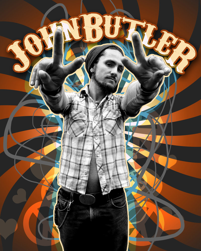 Description: A man making the vulcan sign with his hands in front of him and the words johnbutter on the background.